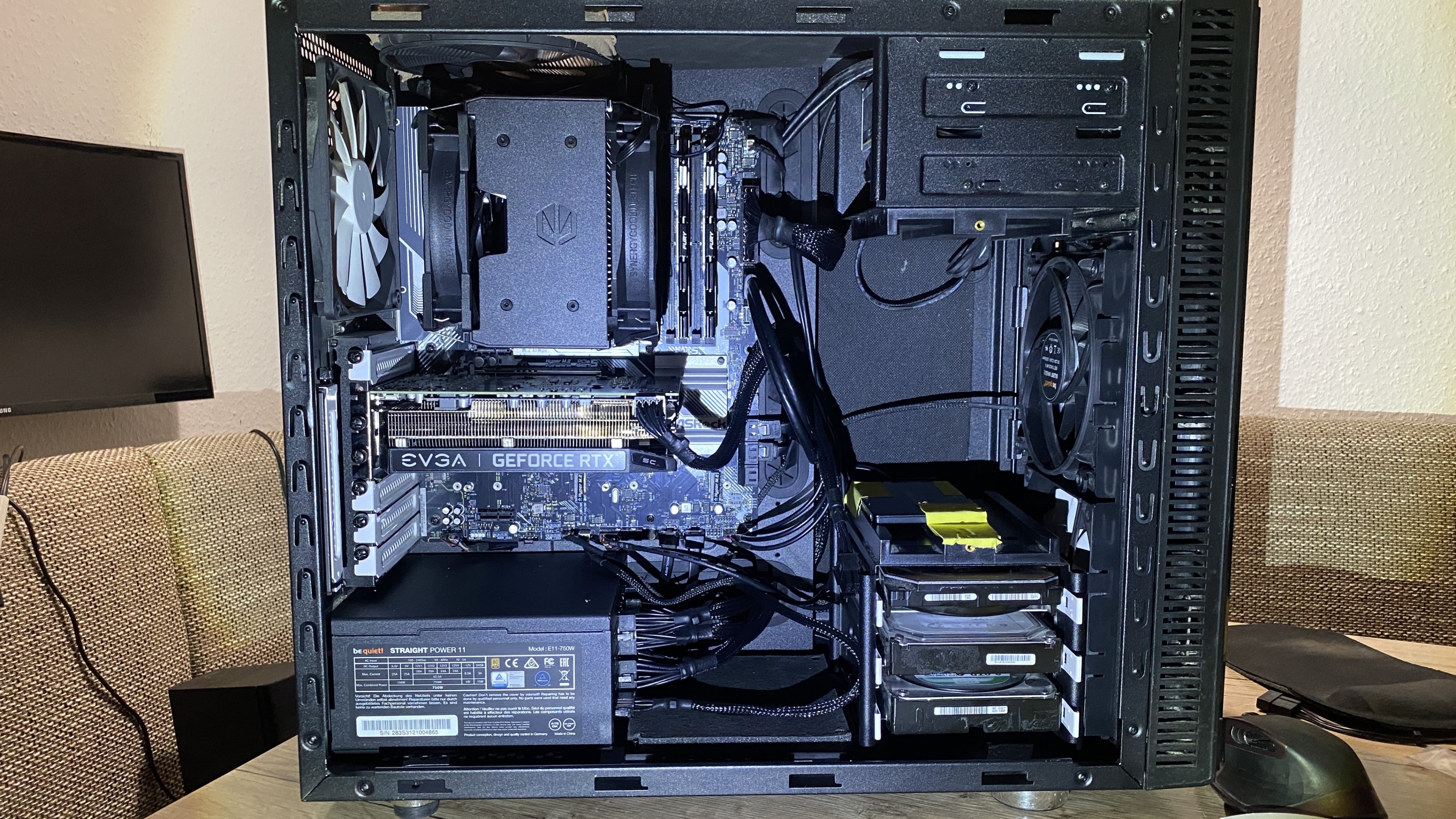 Zur SSD: Ich hatte keinen Platz mehr, also hab ich Sie oben draufgeklebt. Die Kabel haben sie immer schräg gemacht, daher. :-)