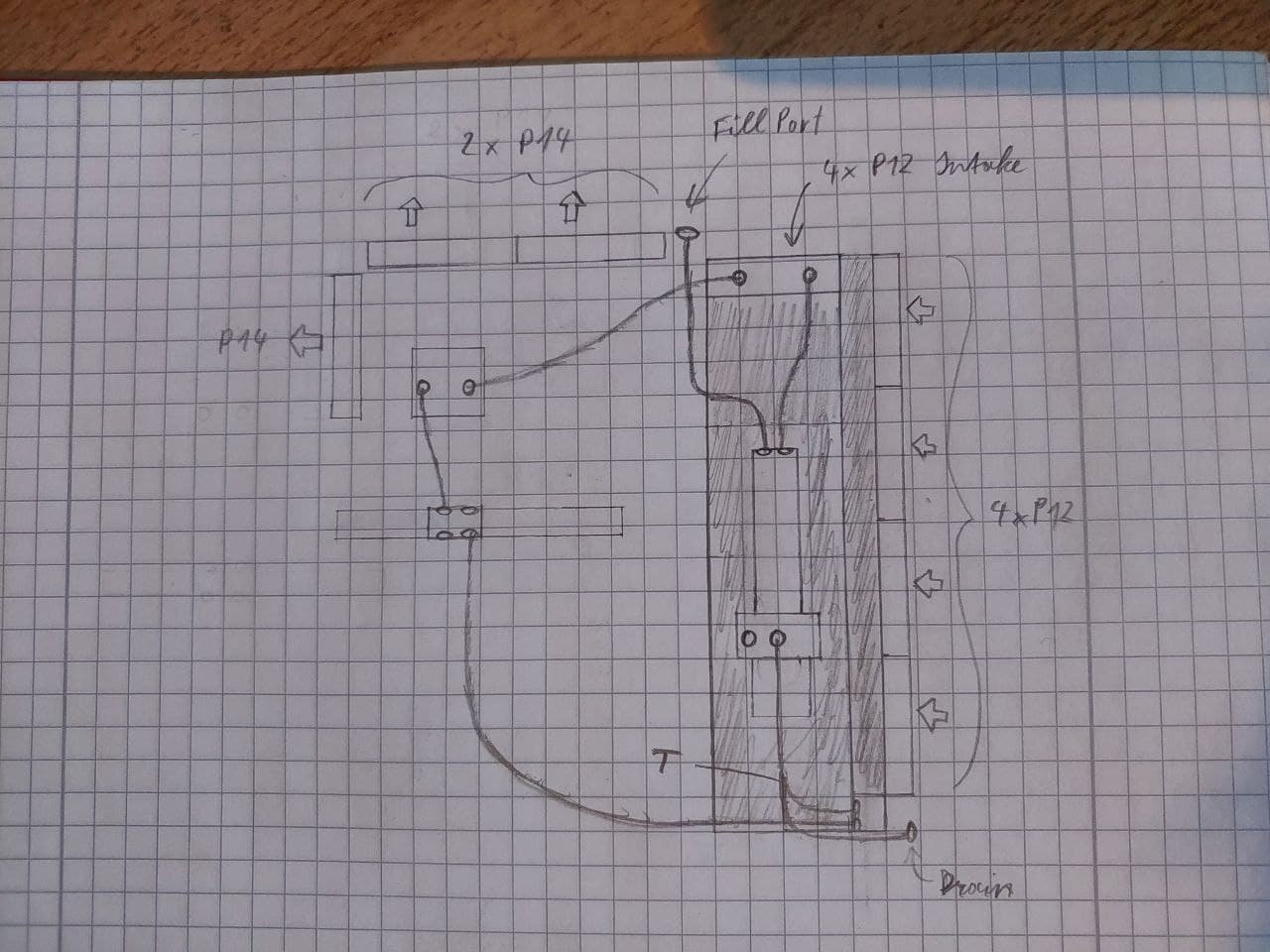 Wobei der Aufbau derzeit so geplant ist wie in der angehängten Zeichnung (da es ja eigentlich keinen/kaum einen Unterschied machen sollte, in welcher Reihenfolge die Komponenten sind, hab ichs derzeit so geplant, dass beim seitlichen Radiator die Anschlüsse oben, und beim Vorderen unten sind, damit die nicht Kollidieren können. Hab schon Bilder gesehen wo das teils sehr eng werden kann)