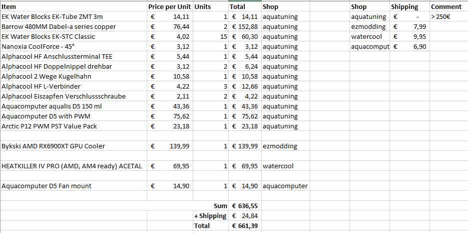GPU Block: Bykski AMD RX 6900/6800 (XT) (Backplate ist inkludiert), wobei ich hier Meinungen gelesen hab, dass Anschlüsse aus Acryl nicht unbedingt empfohlen werden. Als Acetal-Alternativen gäbs ja den Block von EK (wobei da die Backplate extra zu kaufen wäre), oder Alphacool, wo jedoch die Vorderseite voller silberner, "ungeordneter", Schrauben ist, der Acetal Block jedoch schwarz, irgendwie stört mich das 😂