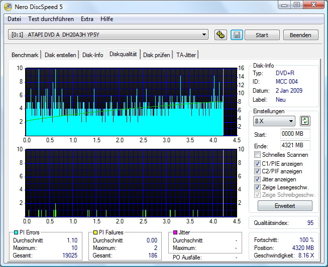 Die LG-Brenner unterstützen den Qualitäts-Scan nicht. Nur LiteOn können ohne Einschränkunge den Qualitäts-Scan durchführen (nur DVD). NEC-Brenner können das auch, aber nur mit deaktivierten Jitter. Ein paar Samsung soll es auch noch geben die sowas können.