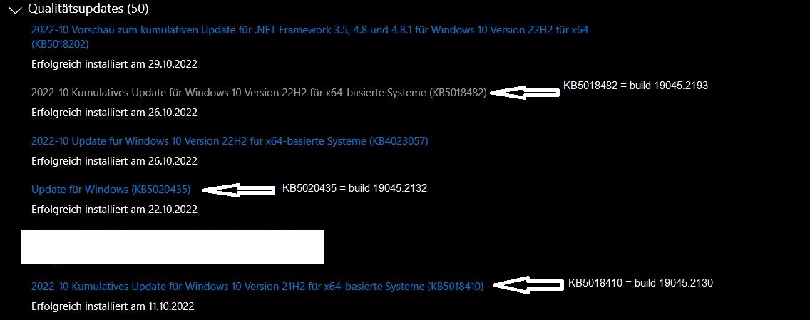 Hab mal nen Screen von meinem Updateverlauf mit dran gehangen welche alle über Windowsupdate rein kamen des KB5018482 welches den Build auf 19045.2193 hebt war das Optionale kumulative vom 26.10