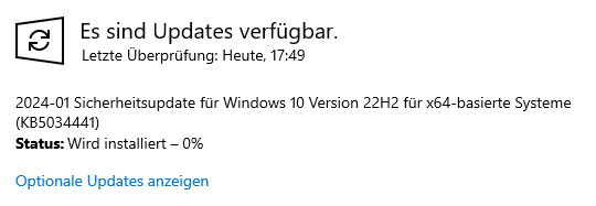 Update KB5034441 gestern lief in den bekannten Fehler 0x80070643.