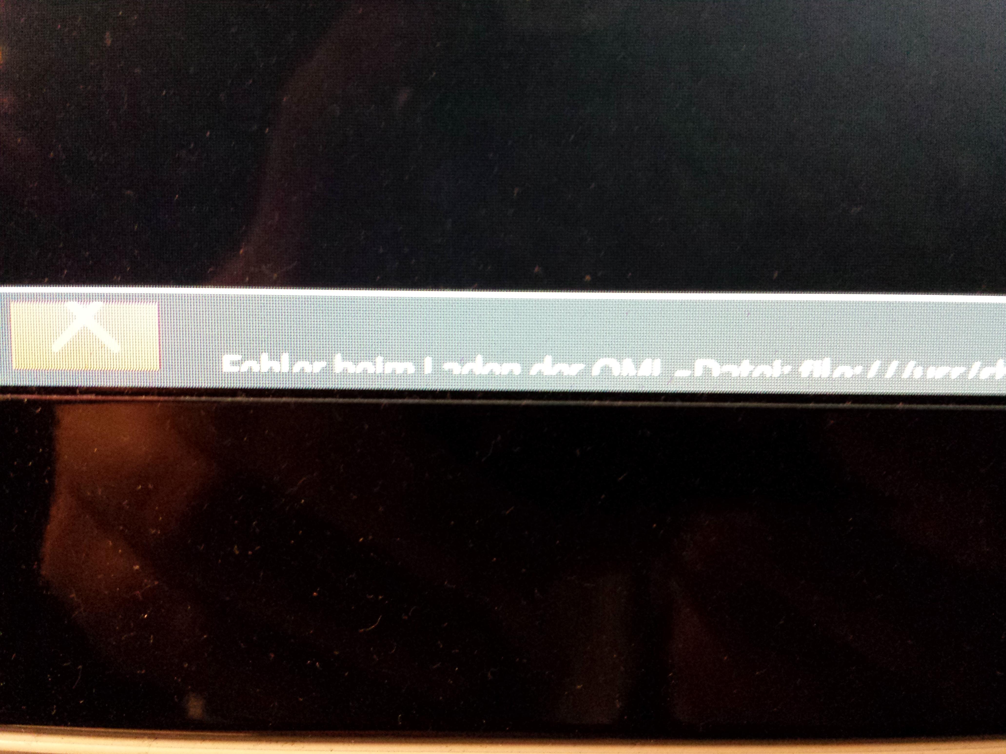 Seitdem lädt er KDE nicht mehr. Wenn ich mich einlogge, bekomme ich mein Hintergrundbild zu sehen und eine kaputte Kontrollleiste mit einem großen roten "X" Links und dahinter ein Text. Den Text kann ich aber kaum Lesen, da die Buchstaben vertikal halbiert (also abgeschnitten) sind. Ich vermute da steht folgendes: