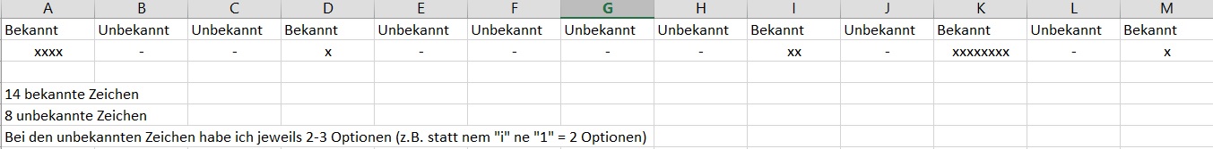 Die einzige Lösung die mir jetzt einfällt: Gibt es ein Tool oder etwas ähnliches, bei dem ich alle möglichen Kombinationen anhand des gegebenen Inputs testen kann? Habe bereits alles in ne Exceltabelle mit x Spalten geschrieben, 50 Kombinationen erstellt und dann alle ausprobiert, aber 50 ist bei 10 offenen Variablen sehr wenig... Je Variable kommen 2-3 Möglichkeiten in Frage.