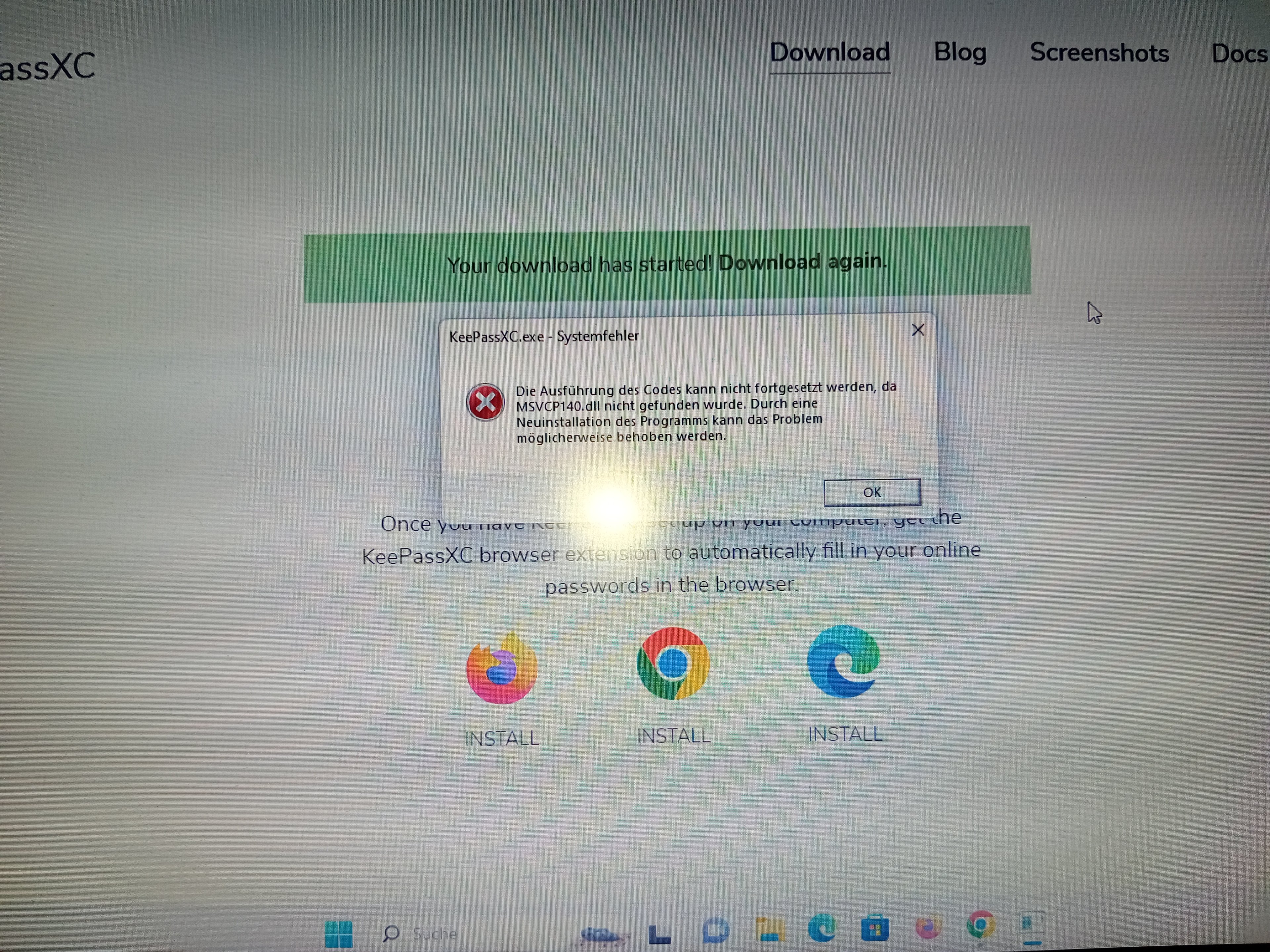 ich habe versucht zusätzlich Keepass XC auf mein Laptop zu installieren. Habe es auch schon erneut deinstalliert und nochmal versucht zu installieren, wie in der Meldung steht.
