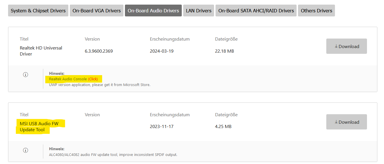 Nun habe ich von der MSI-Seite den aktuellen Realtek-Treiber heruntergeladen und installiert, aber es funktioniert leider immer noch nicht. Auch im BIOS ist der HD Audio Controller aktiviert.