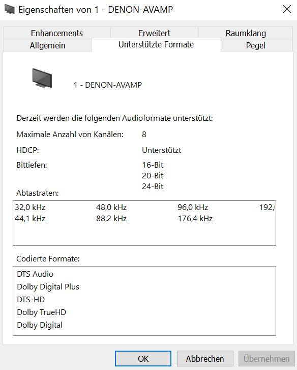 Unter "Eigenschaften Denon-Amp" werden mir aber sämtliche unterstützen Audioformate korrekt angezeigt: