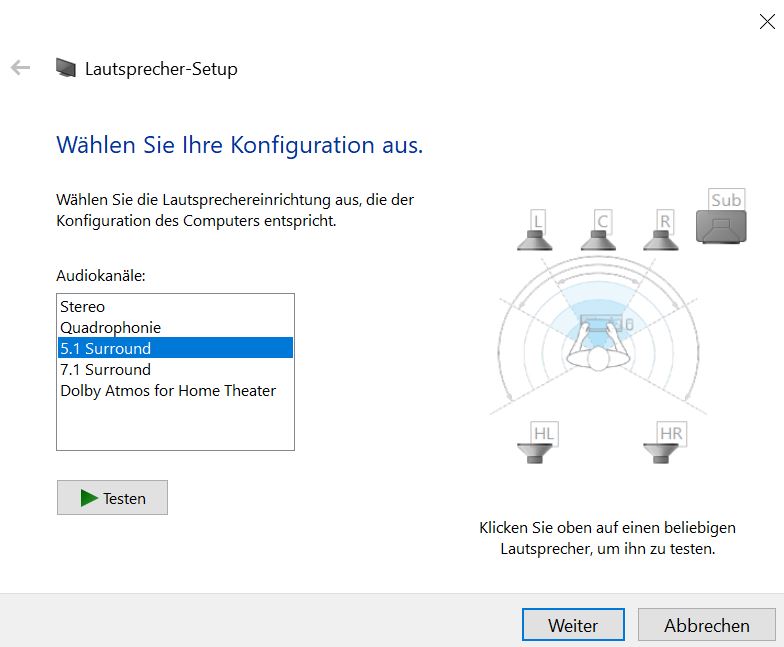 Unter Windows jedoch kommt bei der Lautsprecherkonfiguration nur 2.1 Ton - obwohl mir alle Lautsprecher angezeigt werden: