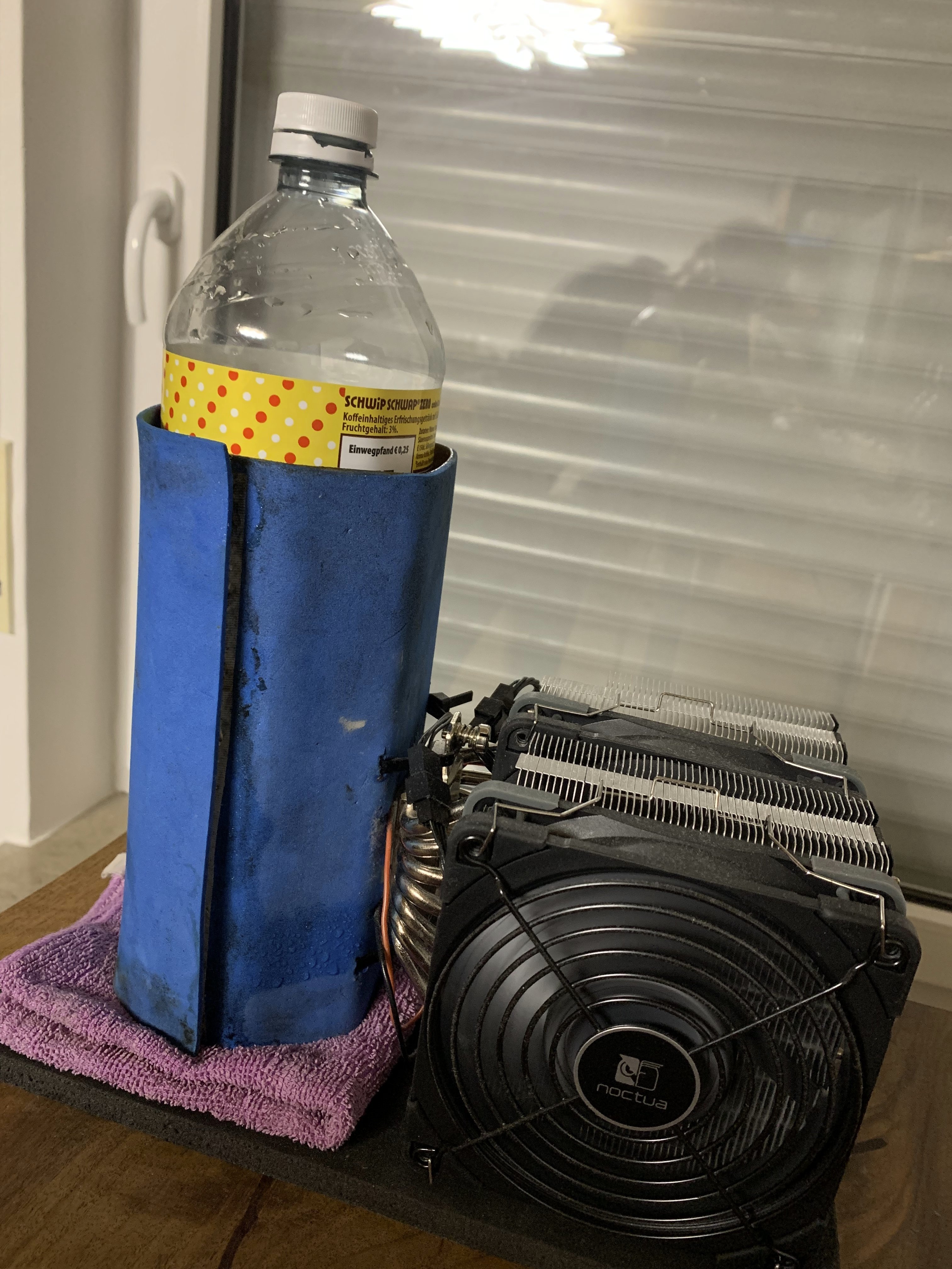 Dicke EPDM-Matte drunter damit das kalte Kondenswasser nicht den Holzschreibtisch zerstört, ein Lappen als Tropfenfang...