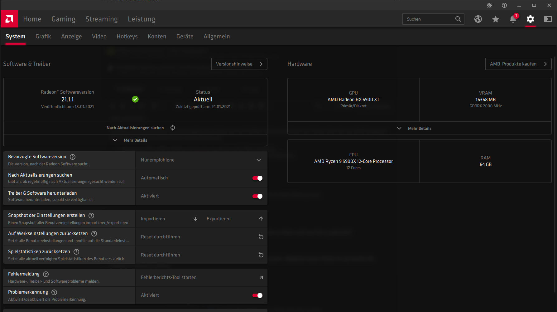 - Grafikkarte: XFX 6900 XT mit aktuellstem Treiber 21.1.1 vom 18.01.2021