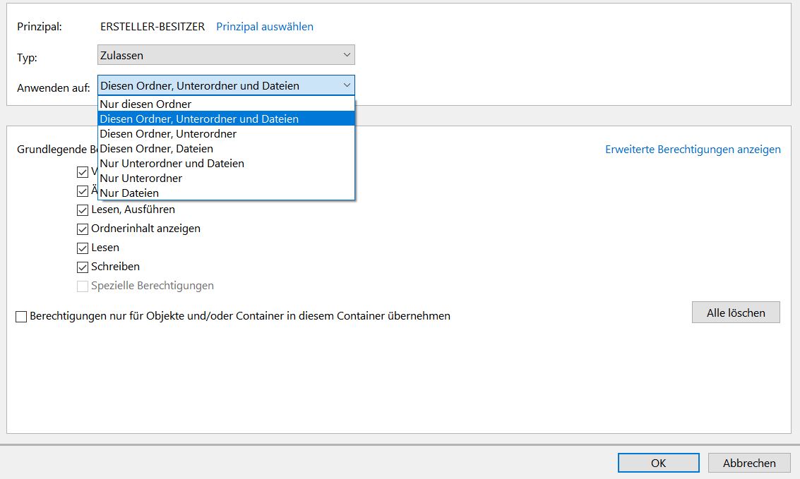 Zudem gibt es auf der Festplatte noch das Konto "ERSTELLER-BESITZER", bei welchem ich die Berechtigungen überhaupt nicht ändern kann. Dort ist immer "Nur Unterordner und Dateien" eingetragen und trotzdem hat sich an den Berechtigungen nichts geändert. Wenn ich die Berechtigungen ändere, stellt es sich nach einem Klick auf "Übernehmen" wieder zurück zu "Nur Unterordner und Dateien".