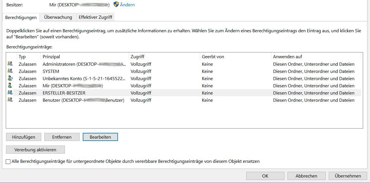 Also über Eigenschaften -> Sicherheit -> Erweitert die Berechtigungen überprüft. Unter Besitzer ist mein Konto eingetragen. Die Berechtigungen konnte ich auf Vollzugriff ändern. Die Berechtigungen werden aber grundsätzlich nicht für Unterordner und Dateien übernommen. Damit die Änderungen wirksam werden, muss ich die Berechtigungen für jede einzelne Datei und jeden einzelnen Unterordner ändern.