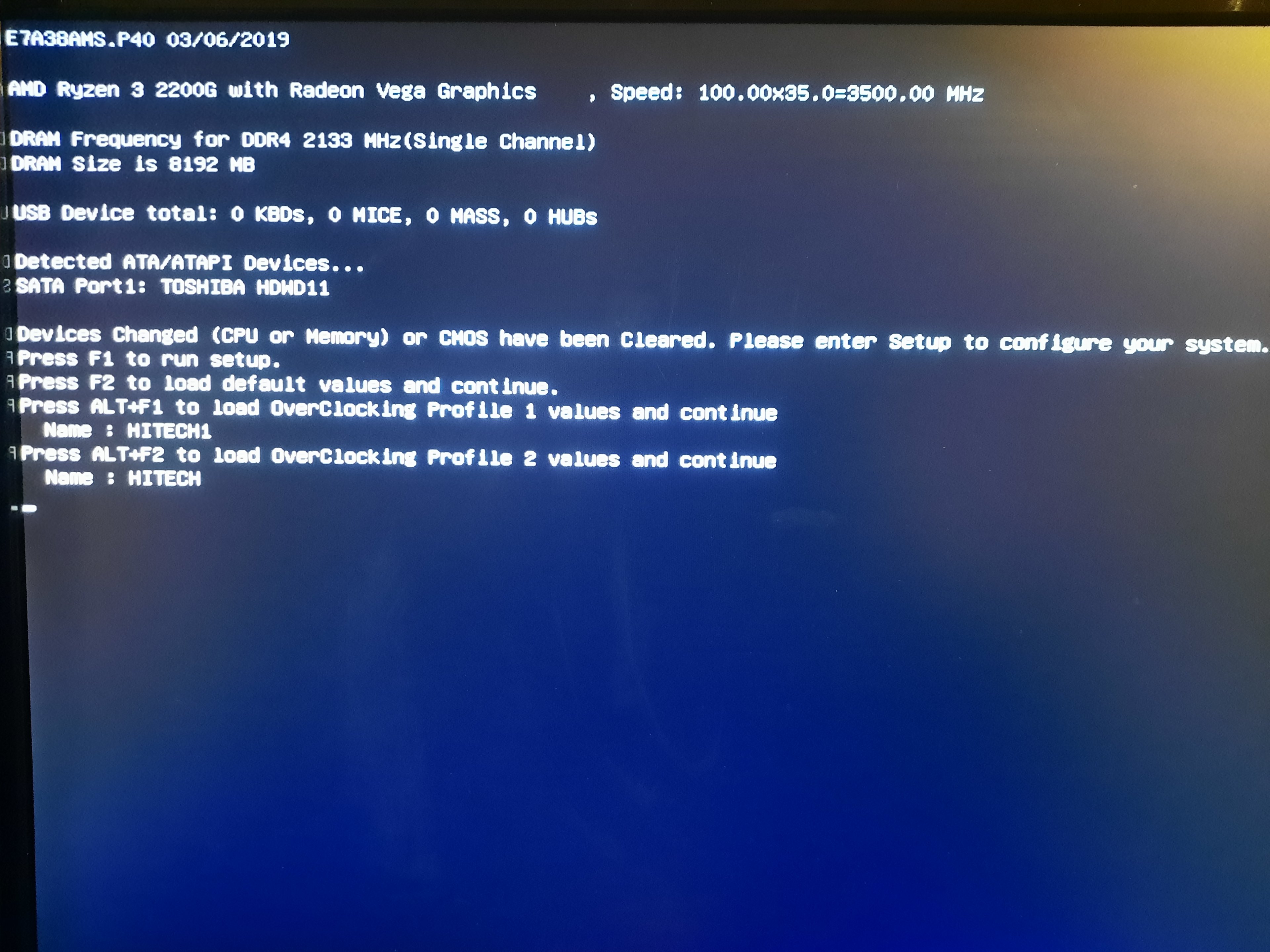 Du kannst jetzt mit F1 ins Bios um je nachdem Einstellungen vorzunehmen,