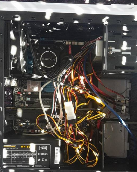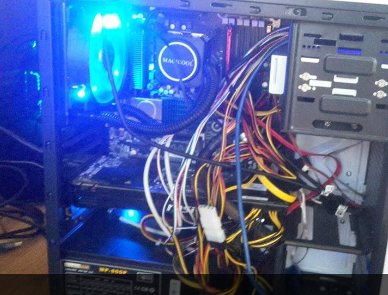 Die Verkabelung scheint eigentlich ordentlich zu sein, zumindest sehe ich auf Anhieb keine Fehler. Der PC startet auch, alle Lüfter funktionieren, d. h. alle drei zusätzlich eingebauten sowie der vorhandene Gehäuselüfter (nur einer, da gebrauchtes Gehäuse) sowie der Lüfter der Wasserkühlung. Ein Teil der Lüfter ist über eine Lüftersteuerung mit dem Netzteil verbunden, ein anderer Teil mit dem Mainboard.