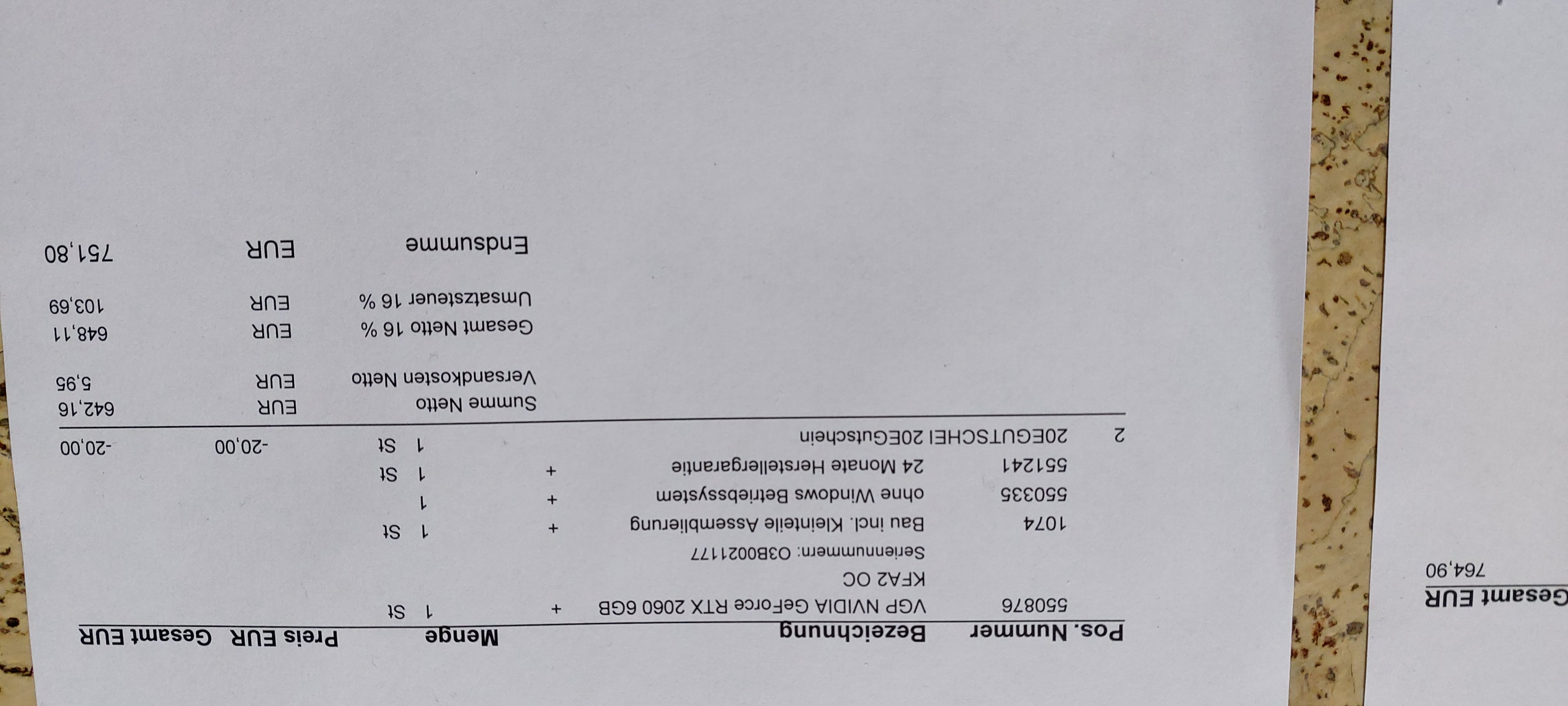 Ich poste mal gleich noch die Rechnung mit allen Teilen, aber in Summe 750 Euro. Und hab das Netzteil und das Board nicht wirklich aufgerüstet da ich ehrlich gesagt nicht so viel brauche, hab die RTX auch nur genommen weil die GTX 1660 S ausverkauft war. Bin halt davon ausgegangen, dass das funktioniert wenn man in den Konfigurator schreibt man braucht sich um die Kompatibilität keine sorgen machen, die haben das alles geprüft. Und zum Thema Verpackung, daran kann man echt nicht meckern innen war alles abgestützt und der PC war auch sicher verpackt. Weiß allerdings nicht wie die Post im Weihnachtsstress mit den Sachen umgeht.