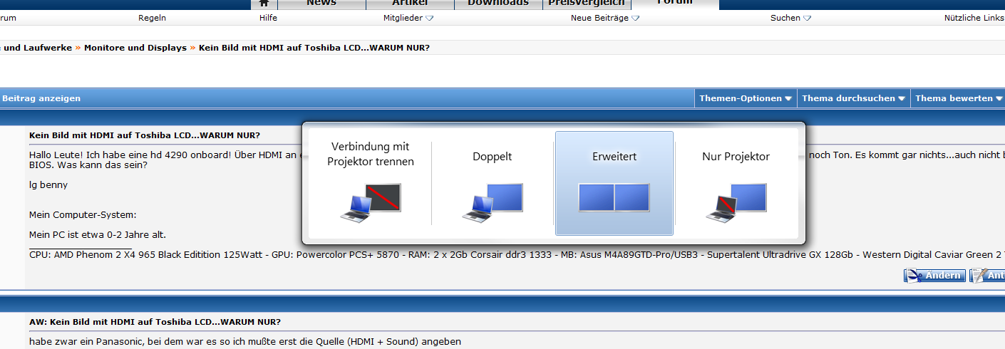 Hallo Leute! Ich habe eine hd 4290 onboard! Über HDMI an einem Toshiba LCD. Alles lief einwandfrei. Jetzt habe ich einen anderen Toshiba und plötzlich habe ich weder Bild noch Ton. Es kommt gar nichts...auch nicht beim Start vom BIOS. Was kann das sein?