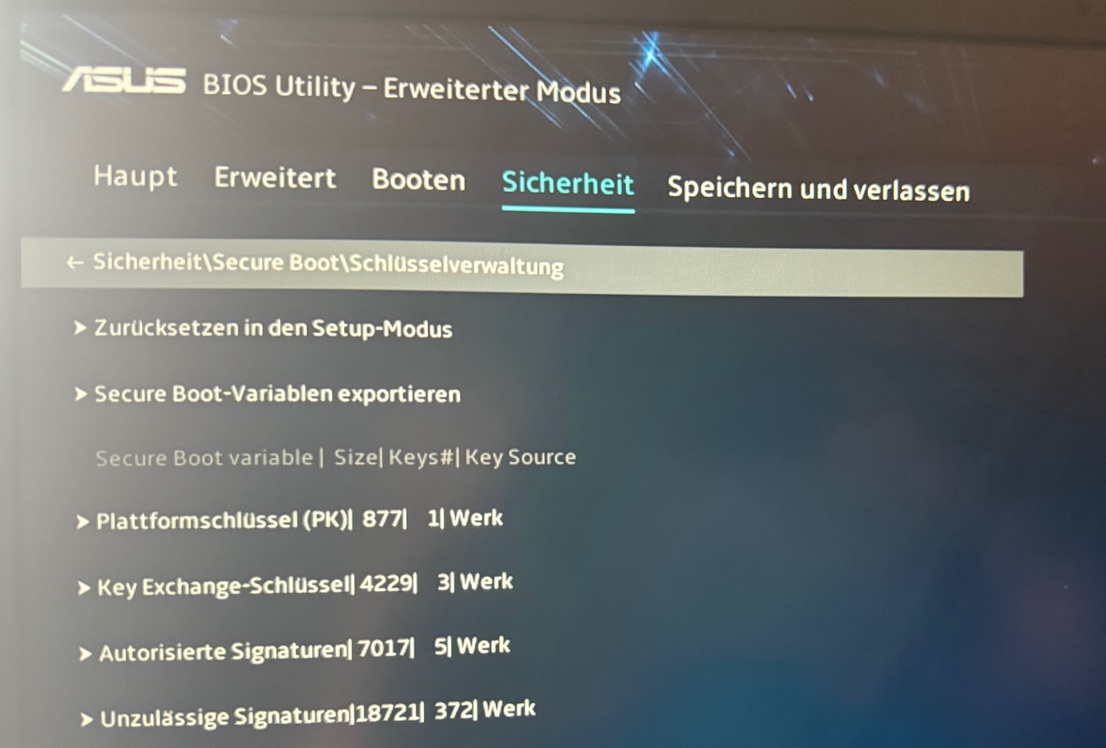 Aufgefallen sind mir im BIOS unter SECURE BOOT unterschiedliche Schlüssel. Ob es daran liegt?