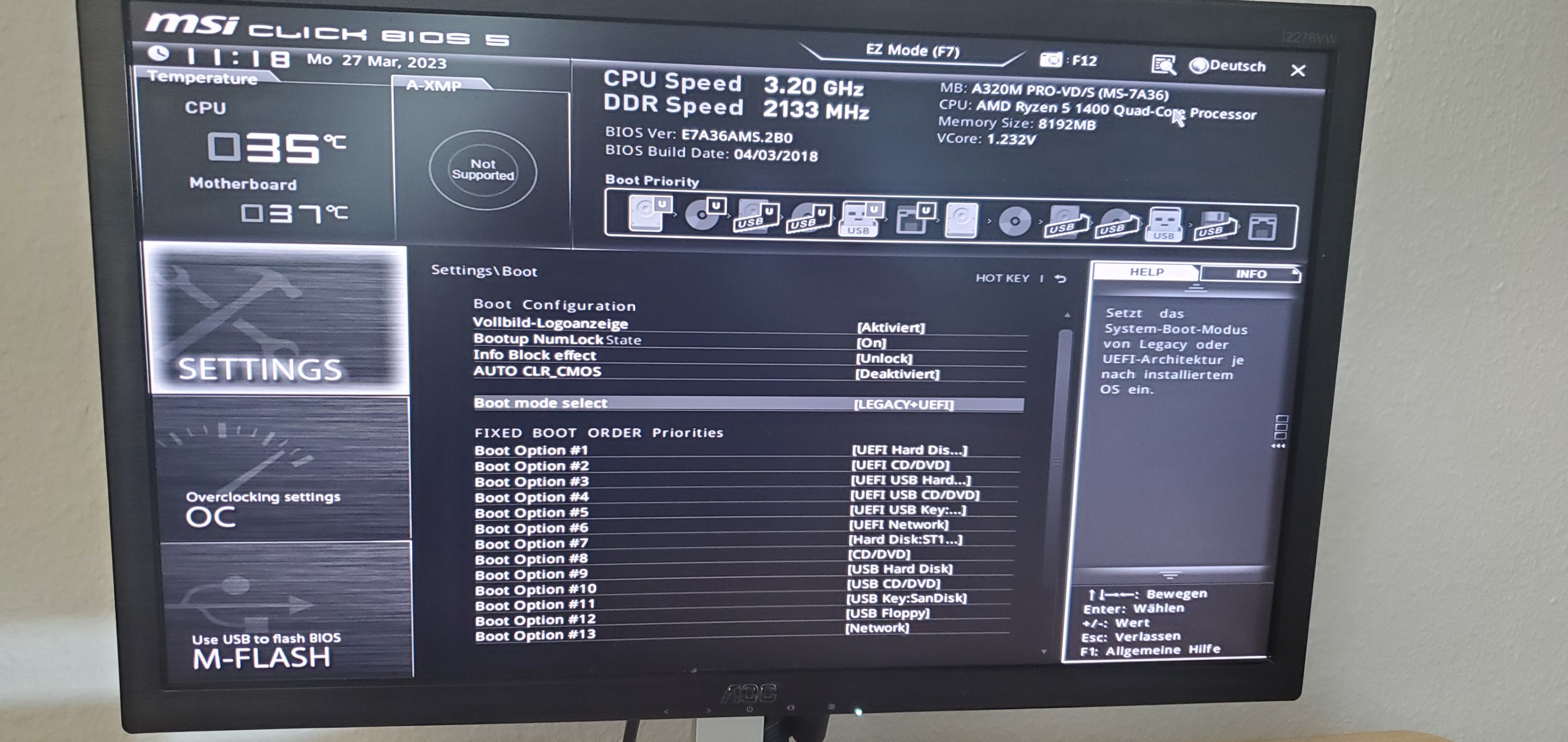 Hab über das BIOS vom Mainboard versucht die Bootreihenfolge auf den USB Stick zu priorisieren, aber da hat der dann gar nicht gebootet. Hab auch versucht unter SAVE / EXIT "Standardeinstellungen wiederherstellen" zu machen, aber auch das hat nicht geklappt.