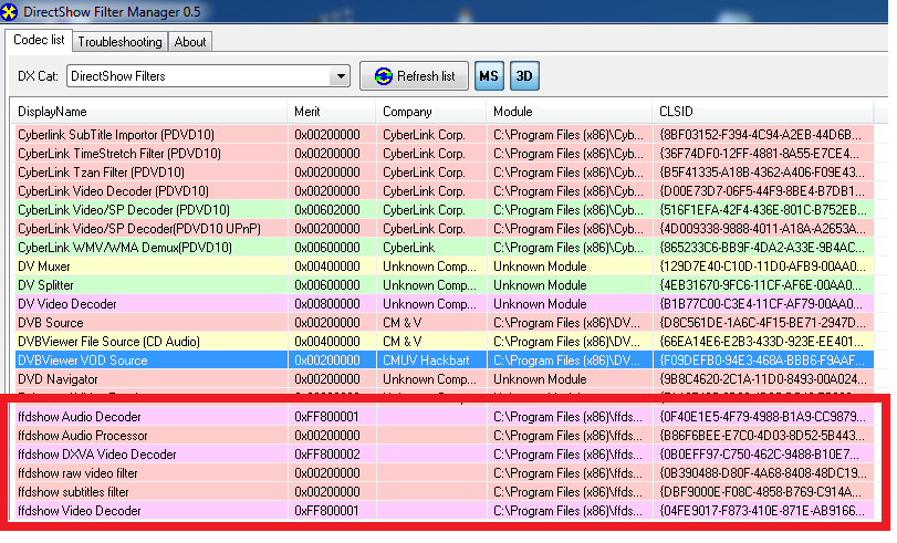 Aber Video (ein Rotes) wird bei dir nicht von ffdshow decodiert. Schau mal beim MPC HC nach welche Filter und Rechtsklick=>Filter stehen.