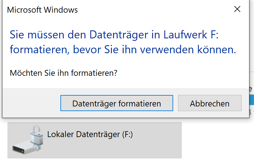 Verschriftlichung: Sie müssen den Datenträger in Laufwerk F: formatieren, bevor Sie ihn verwenden können. Möchten sie ihn formatieren?