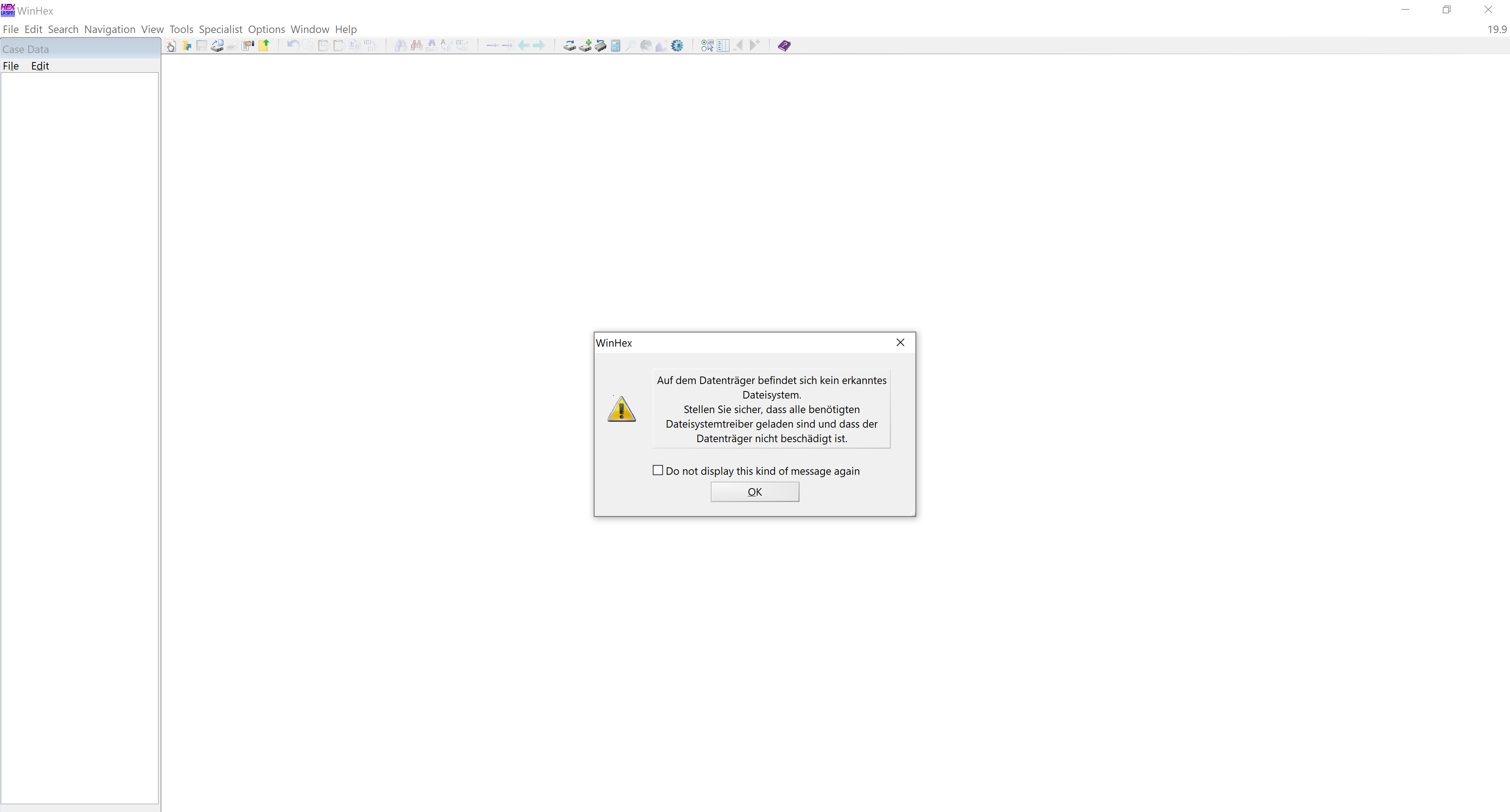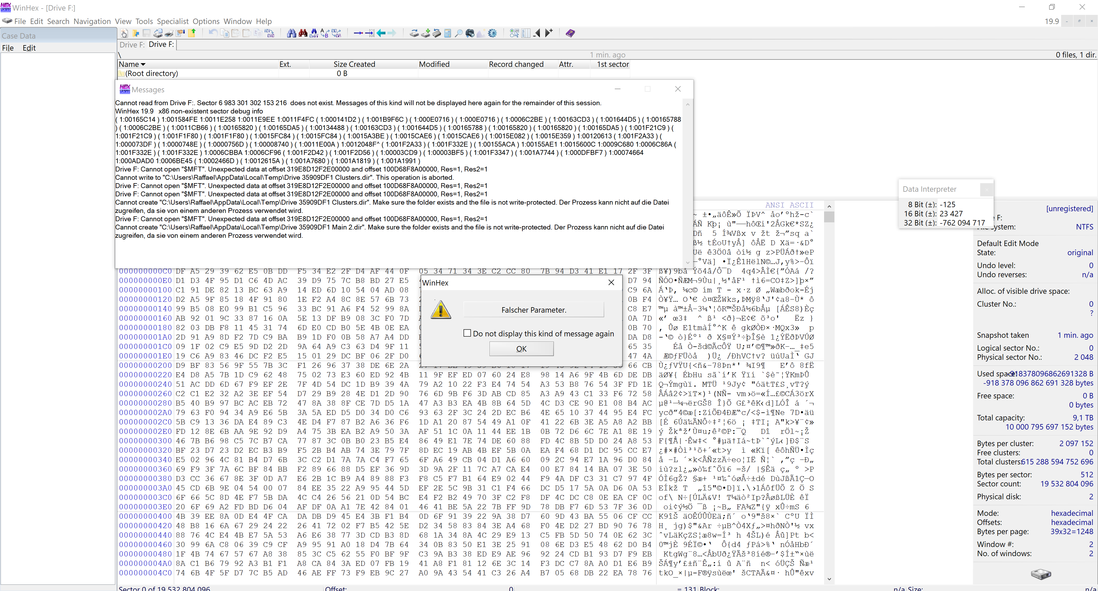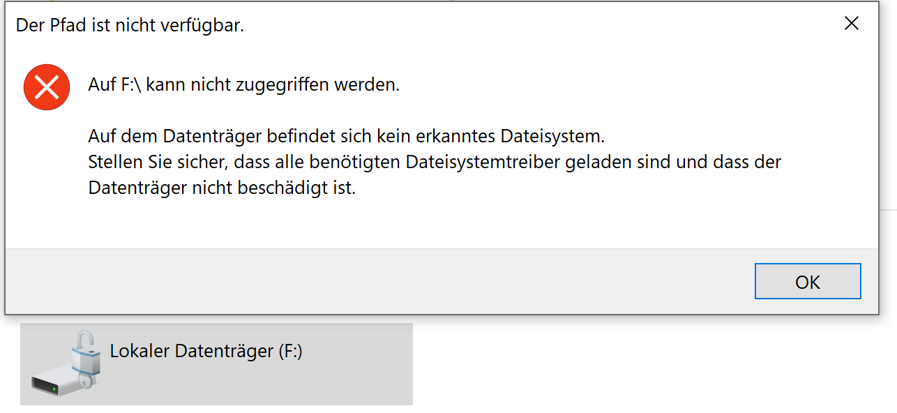 Verschriftlichung: Auf F:\ kann nicht zugegriffen werden. Auf dem Datenträger befindet sich kein erkanntes Dateisystem. Stellen Sie sicher, dass alle benötigten Dateisystemtreiber geladen sind und dass der Datenträger nicht beschädigt ist.