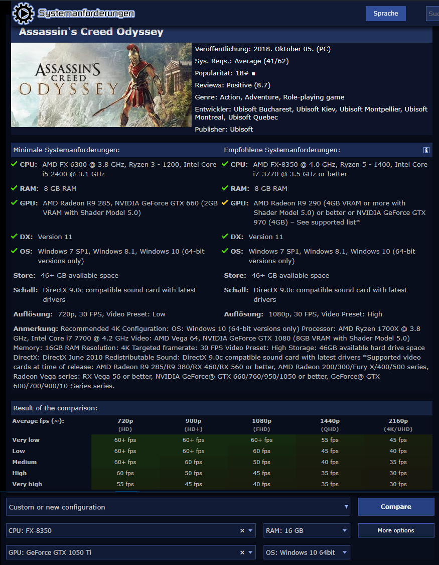 CPU wäre sogar noch okay wenn sie mehr als 4 Kerne hätte. Deine Grafikkarte ist natürlich mittlerweile sehr langsam und war auch damals schon zum Release halt nur Mittelklasse. Sei froh das Odyssey wenigstens auf low mit halbwegs brauchbaren 40-50 FPS läuft^^.