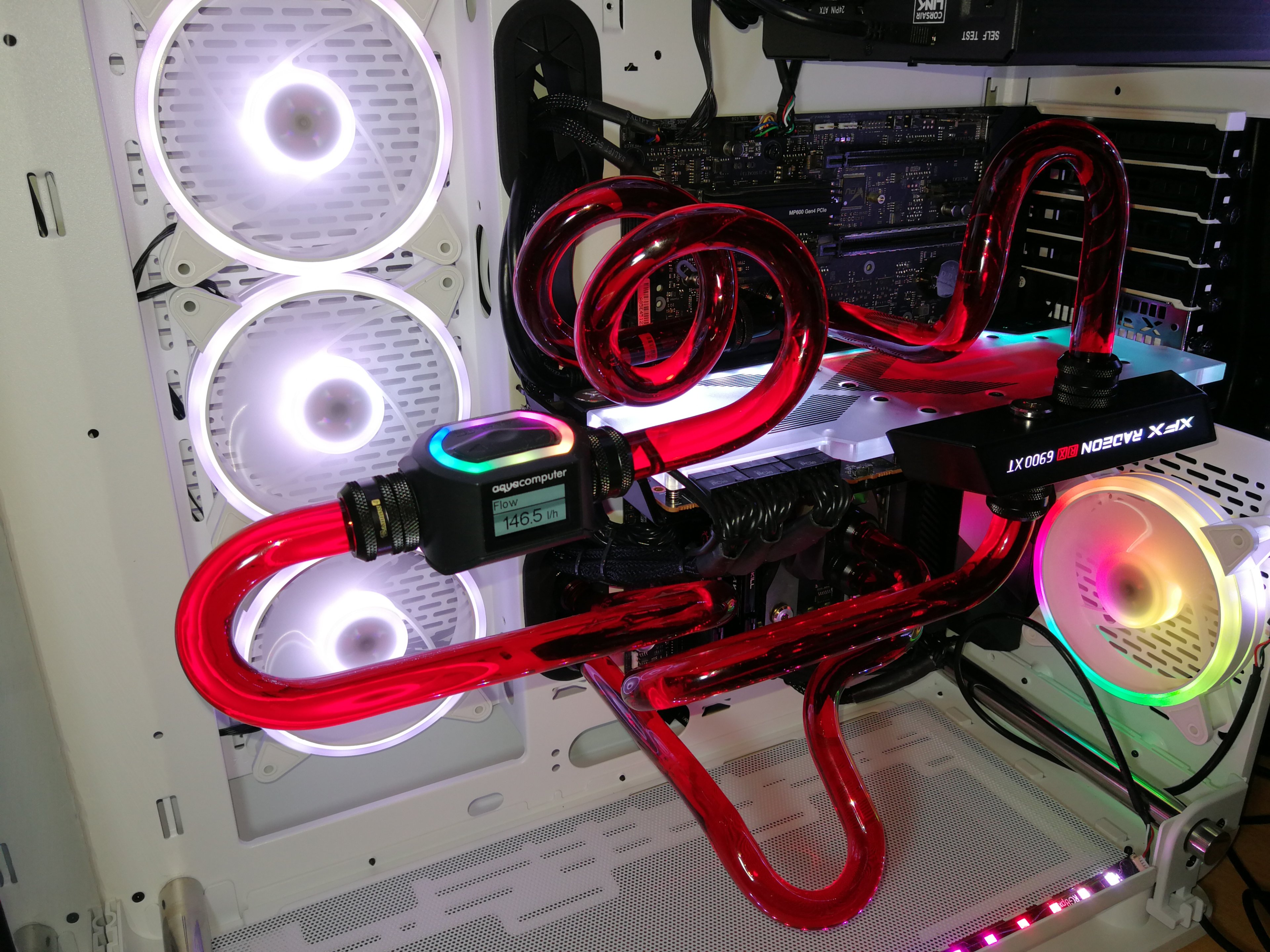 Naja das System mit einer einzigen D5 Pumpe zu betreiben ist schon richtig riskant. Das schafft die Pumpe nicht, hättest du wenigstens X-Flow Radiatoren verbaut und DP Ultra in rot genommen.