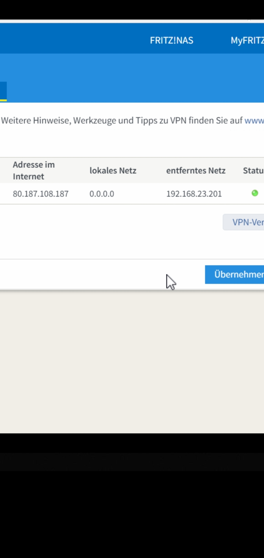 VPN-Verbindung zum Smartphone wird aufgebaut und steht, allerdings kann man auf dem Smartphone weder surfen noch auf das an ser fritzbox hängende NAS zugreifen.