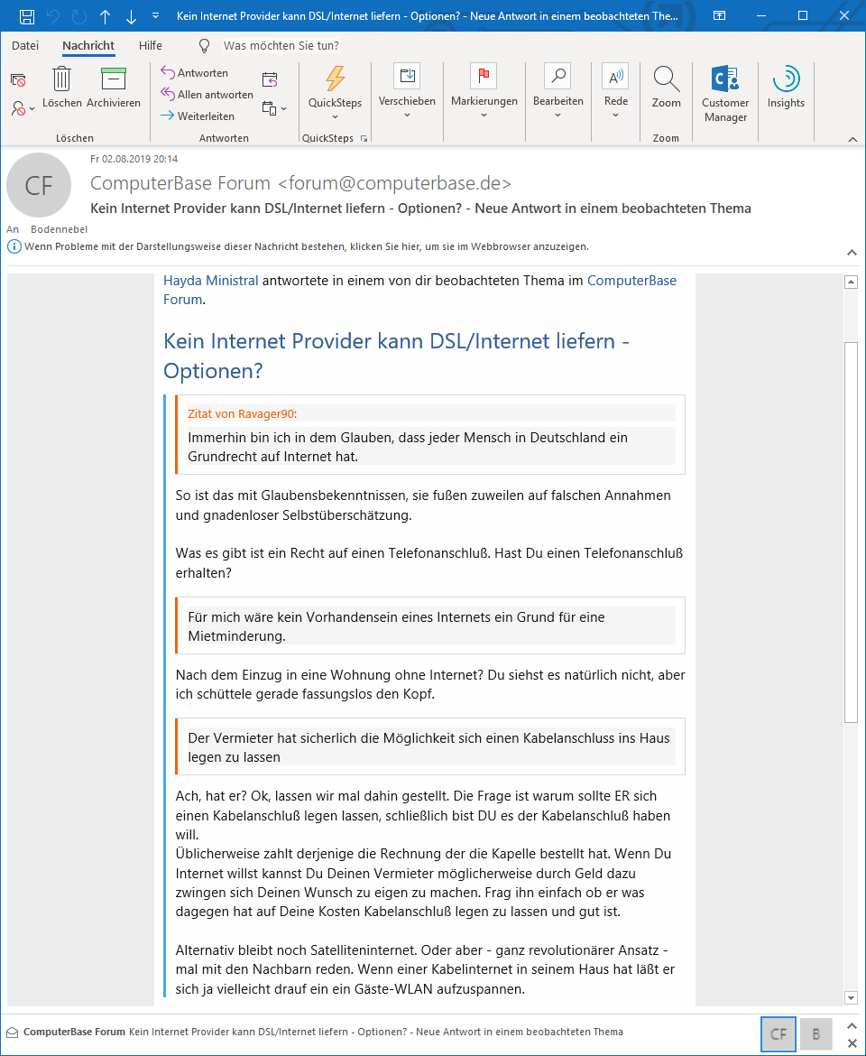 Ich habe den Beitrag genauso gelesen und hab da gar kein Problem damit. Ich spinne in dem Fall auch erstmal komplett vor mich hin, weil ich nichts ausschließen will. Und um solche Beiträge bin ich froh, denn damit ist mir klar, dass das nicht der richtige Weg ist. Die Satelliten DSL Methode ist mir auch schon gekommen. Ich leite ihr die von euch genannten Seite auf jeden Fall mal weiter. Das mit der Schüssel wird schon klappen! Aktuell bekommt sie das Gastnetz vom Nachbar und nutzt das auch zur Kommunikation. Ohne wäre sie ja komplett von der Aussenwelt abgeschnitten. Das ist aber einfach keine Dauerlösung, da wie schon sagtet, dass retlich nicht ganz konform ist.