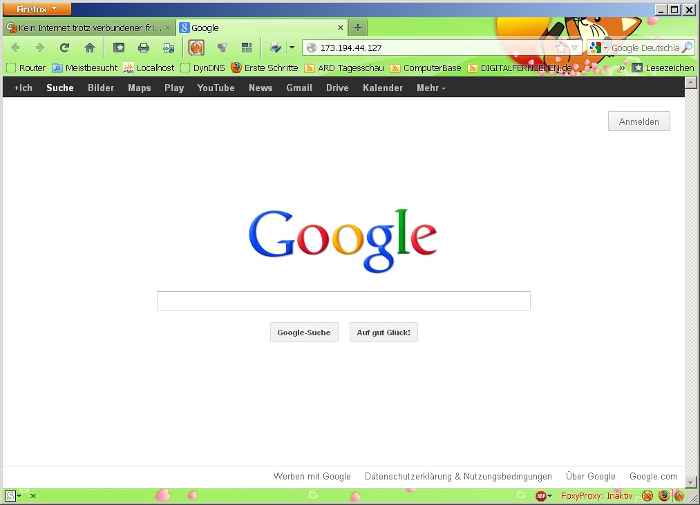 Ich hab die fritzbox+ pc schon mehrfach neugestartet - keine Veränderung, die einzige Seite die ich aufrufen kann ist die Verwaltung der fritzbox welche mir Fröhlich anzeigt alles sei in Ordnung und wo auch Daten im up/Downstream Monitor angezeigt werden. Pc erhält von der Box per dhcp seine IP und die FB als DNS Server, Standardgateway ist ebenfalls die ip der Fb wie es ja eig. Sein soll.