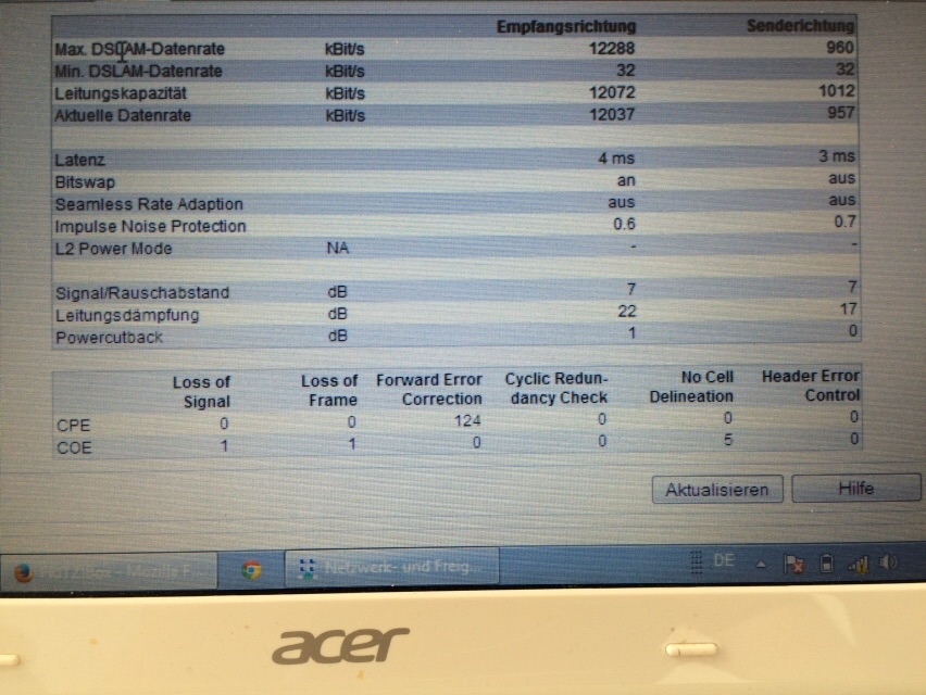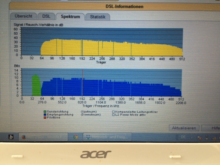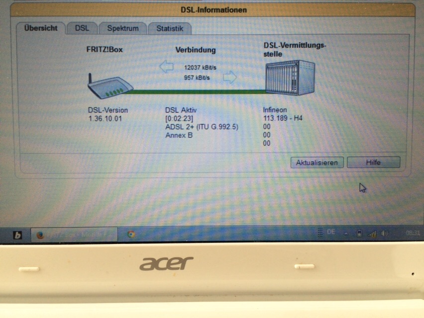 Vorort gibt es lt. DSL-Information (Fritzbox) eine ADSL 2+ Leitung. Die Verbindung zur DSL-Vermittlungsstelle wird auch mit einer grünen Linie angezeigt.