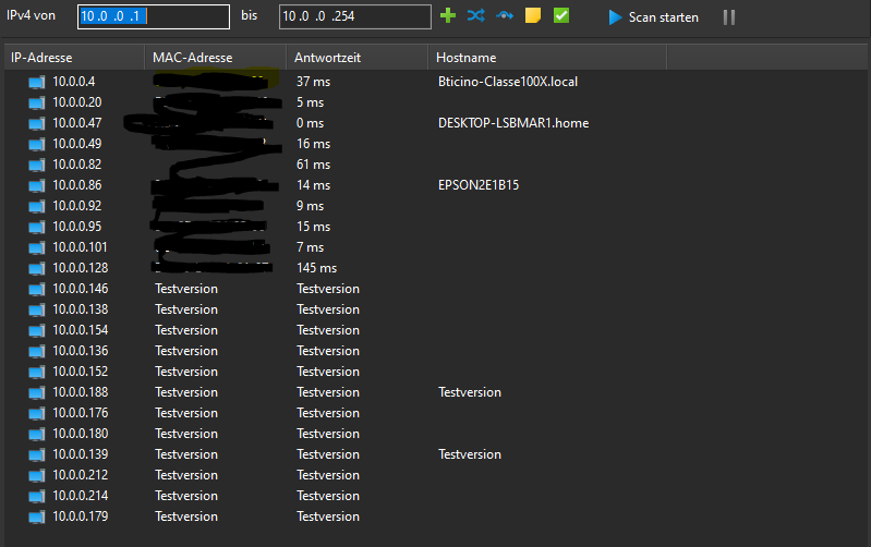 Zeig mal das Ergebnis (MACs kannst du pixeln, private IPs mit 10.0.0.x sind für andere uninteressant).Konsti02 schrieb:Hab den Network Scanner verwendet, der hat nur IPs und MACs ausgespuckt aber keine Namen.