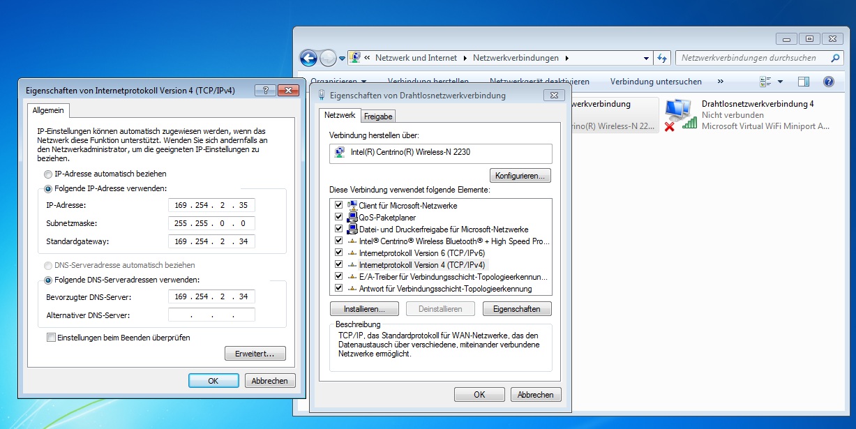 und Windows 7 drauf gemacht. Da kein WLan habe, wollte ich über meinen Desktop-PC via WLan ins Internet, dazu hab ich wie hier beschrieben einen Hotspot eingerichtet.