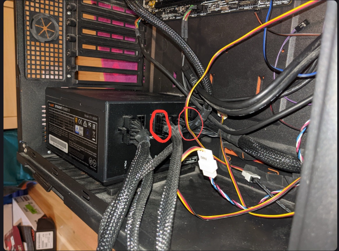 3. Welche Schritte hast du bereits unternommen/versucht, um das Problem zu lösen und was hat es gebracht?Steckverbindungen nochmal überprüft, dabei ist aufgefallen, dass der zweite Stecker im Netzteil neben dem ATX Stecker für das Mainboard nicht im Netzteil eingesteckt war. Eingesteckt brachte leider auch nichts