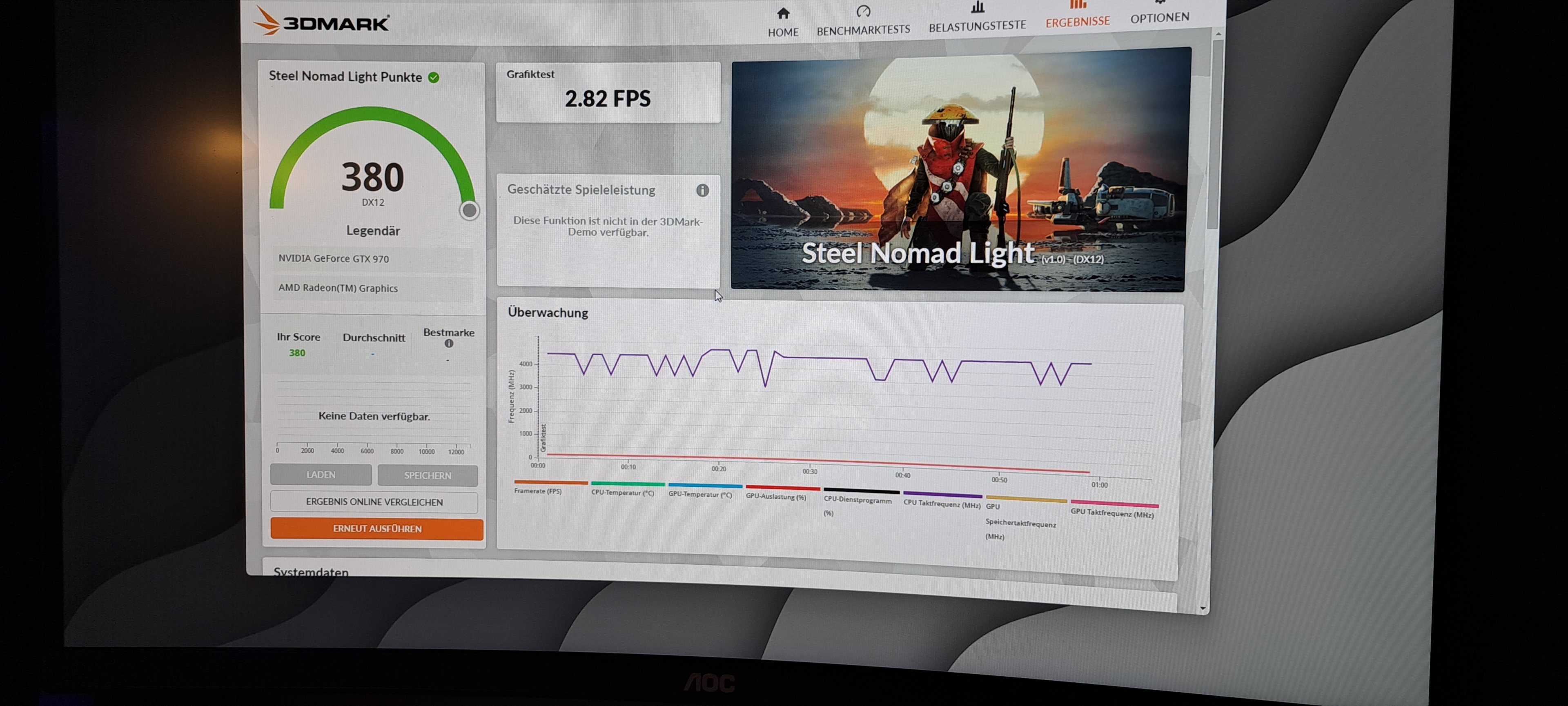 Da arbeitet auch keine GPU, jedenfalls keine funktionierende 970, sollte etwa das Zehnfache an Punkten sein.Daniel18383 schrieb:ich habe auch gerade einen Bechmark in 3d Mark gemacht und gerade einmal 380 Punkte erreicht.