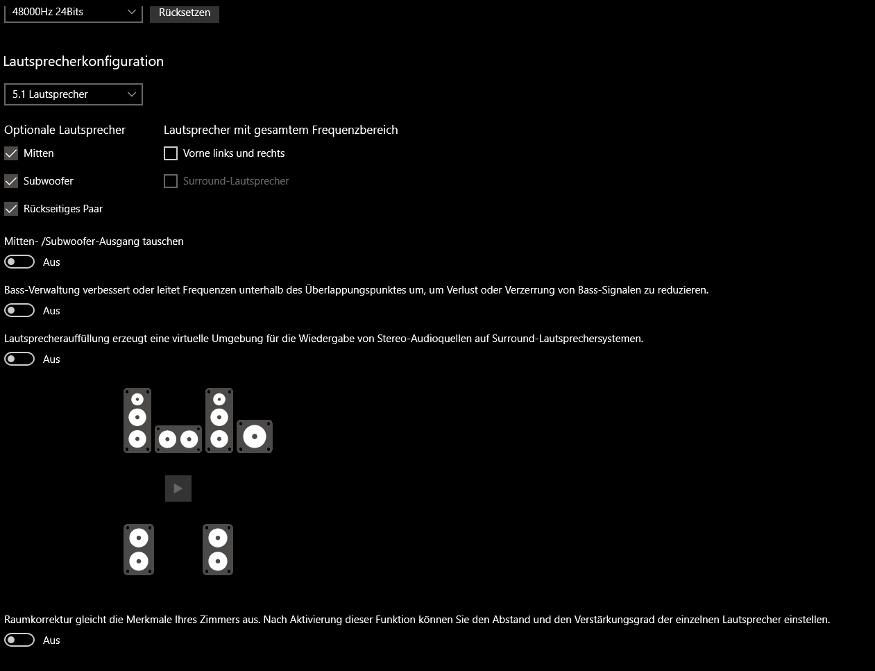 Wenn ich im Windows Lautsprecher Konfigurator die im Bild Rot markierten Boxen zum testen anklicke, steuert Windows die in blau markierten Lautsprecher an.
