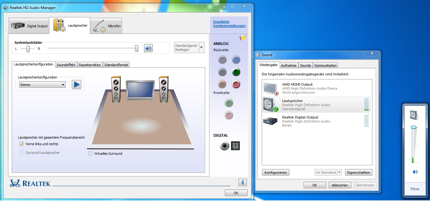Habe heute nach dem Formatieren mein System ganz normal aufgesetzt und natürlich auch die Soundtreiber für meine Realtek ALC892 installiert, nun kommt aber einfach weder Sound aus meinen Boxen/Headset. Es wird mir angezeigt das meine Geräte eingesteckt sind, es wird sogar angezeigt das Musik läuft aber es kommt nichts an. Irgendjemand eine Idee woran es liegen könnte? Bin langsam am verzweifeln.