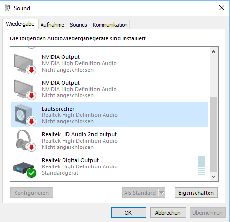Als ich aber dann merkte das ich kein Sound mehr hatte, schaute ich in den Realtek HD Audio Manager rein und ich sah , dass meine 3,5mm Buchsen nicht belegt sind (Pink und Grün). Diese sind einfach Grau hinterlegt und kann sie nicht aktiveren.siehe Bild. Das
