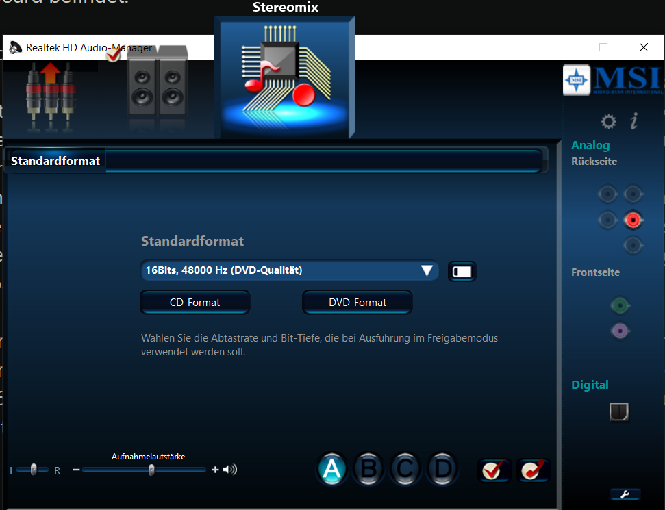 Hast du den Stereomix aktiviert? Im Realtek Manager ist er noch nicht. Da muss er erst drin sein.