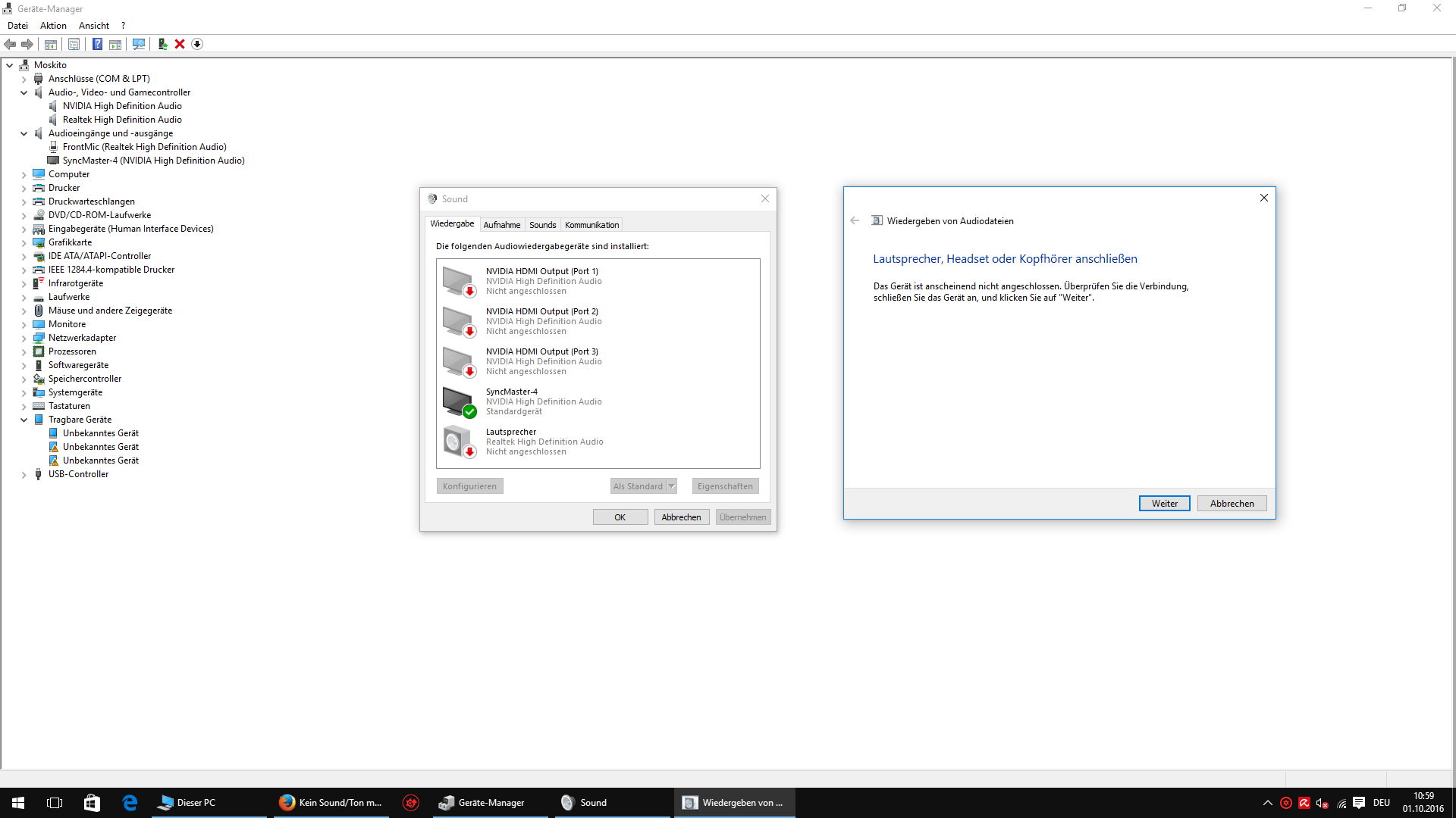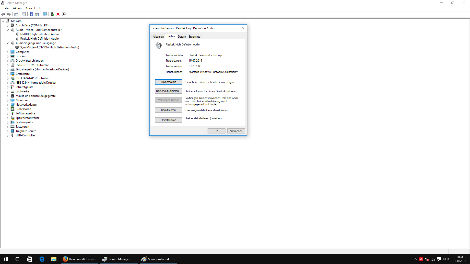 Ich habe vorgestern eine neue Grafikkarte verbaut (GAINWARD 3712 GeForce GTX 1060 (NVIDIA, 6 GB, PCIe)) und vor mehreren Wochen Windows 7 auf Windows 10 upgegraded. Jetzt ist mir aufgefallen, dass ich keinen Sound/Ton mehr bekomme. Ich kann leider nicht sagen, ob der Sound erst seit der neuen Grafikkarte weg ist oder schon seit Windows 10.