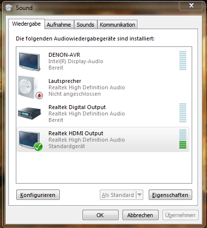 - Im Gerätemanager unter Audio- Video- Gamecontrollers alle NVIDIA HD Audio Komponenten aktiviert, so dass nur die Realtek Komponente aktiv ist. Zusätzlich noch unter der NVIDIA Systemsteuerung unter "Digitales Audio einrichten" die HDMI Soundausgabe deaktivert