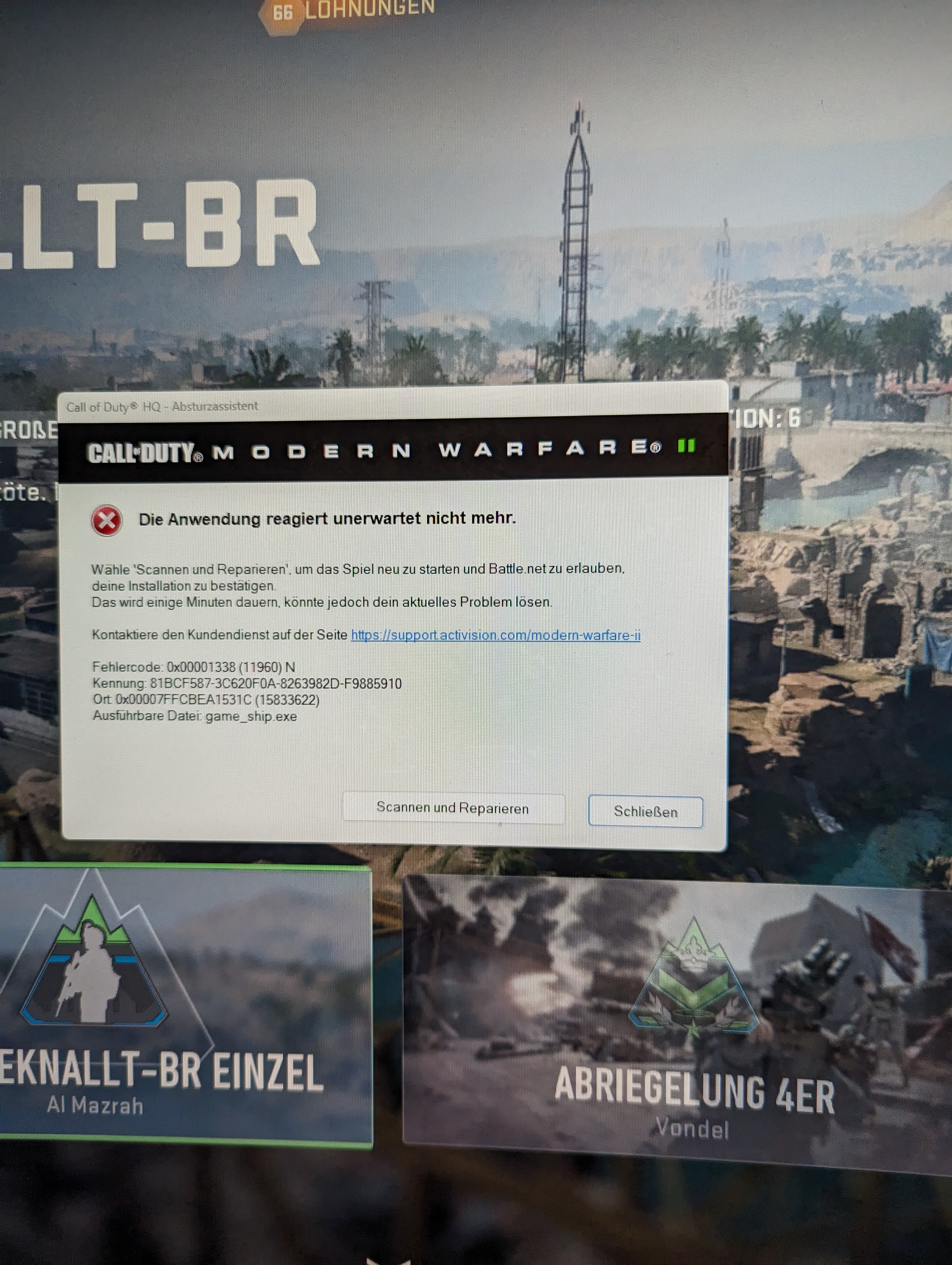 2. Beschreibe dein Problem. Je genauer und besser du dein Problem beschreibst, desto besser kann dir geholfen werden (zusätzliche Bilder könnten z. B. hilfreich sein): Alle Spiele stürzen ab und dann kommt entweder die Fehlermeldung wie auf dem Bild zu sehen bei warzone oder z.b. bei unreal engine spielen steht da