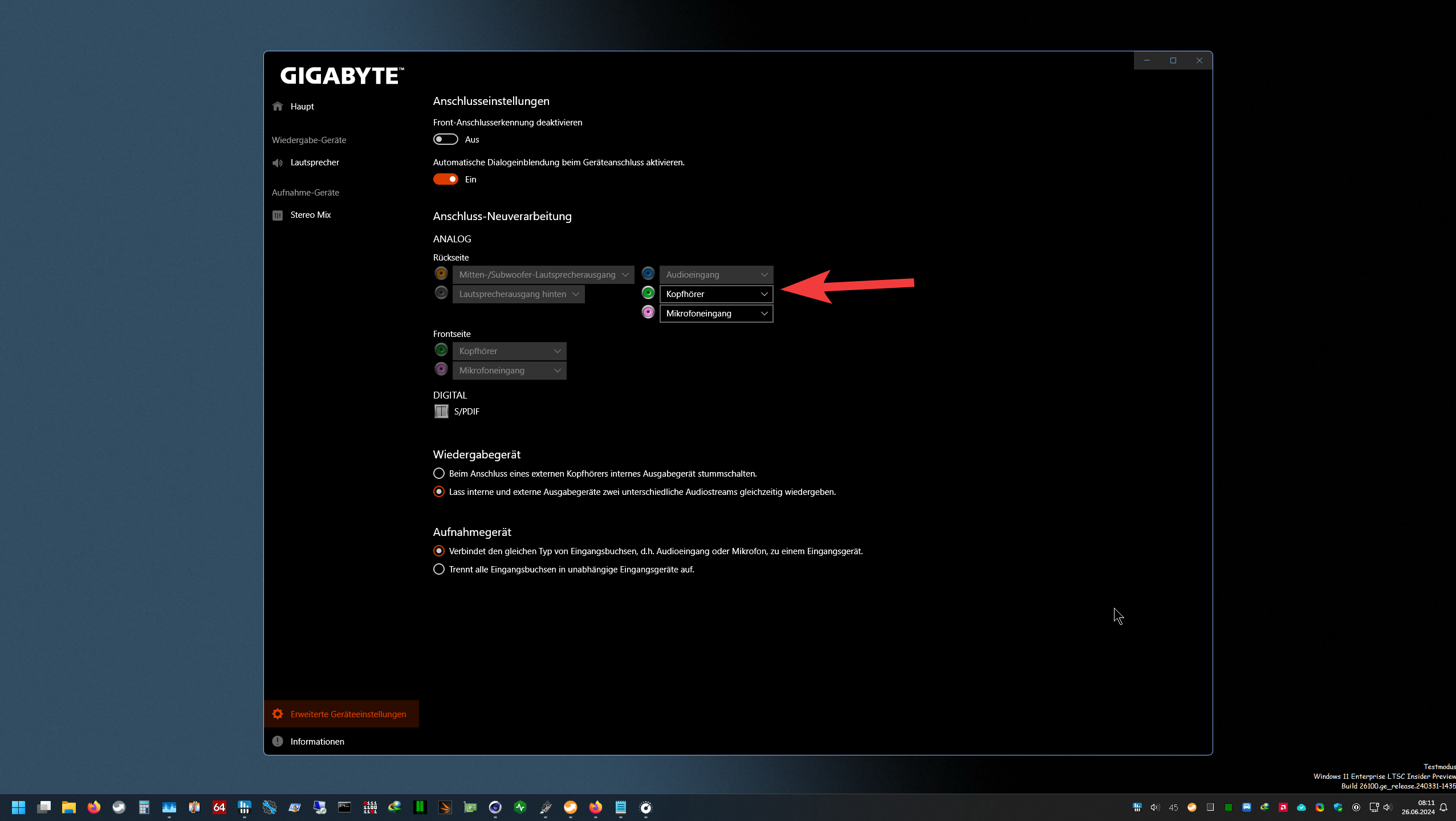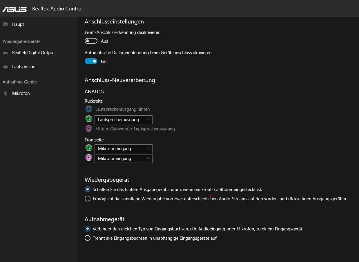 Habe nun ein 2.1 Edifier s530 angeschlossen. Wollte dann über die Realtek Console auf Stereo umstellen, habe aber keinen Sound/Ton mehr. Man sieht aber im Windows bei System/Sound den Pegelausschlag..! Nach Recherche einfach auf den gestrigen Wiederherstellungspunkt zurück und siehe da der Sound ist da.