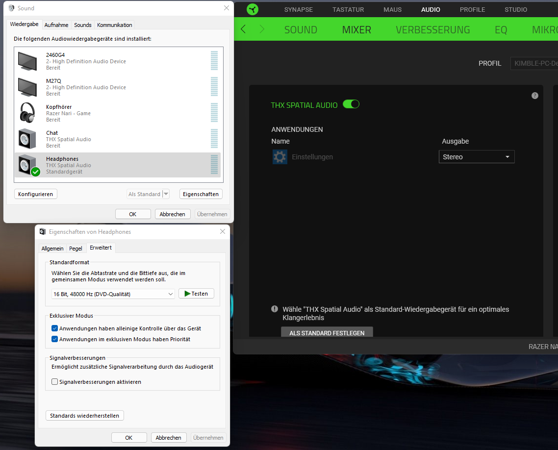 ich habe auf einmal keinen THX Sound mehr (siehe screenshot). Wenn ich auf Kopfhörer Razer Nari - Game stelle kommt wieder Sound. Hört sich aber sch... an. Die Software Razer Synapse 3 habe ich jetzt schon mehrmals de- installiert. Bis heute hat der THX Sound noch funktioniert. Hat jemand ähnliche Erfahrungen gemacht und weiß wieder man das wieder aktiviert.