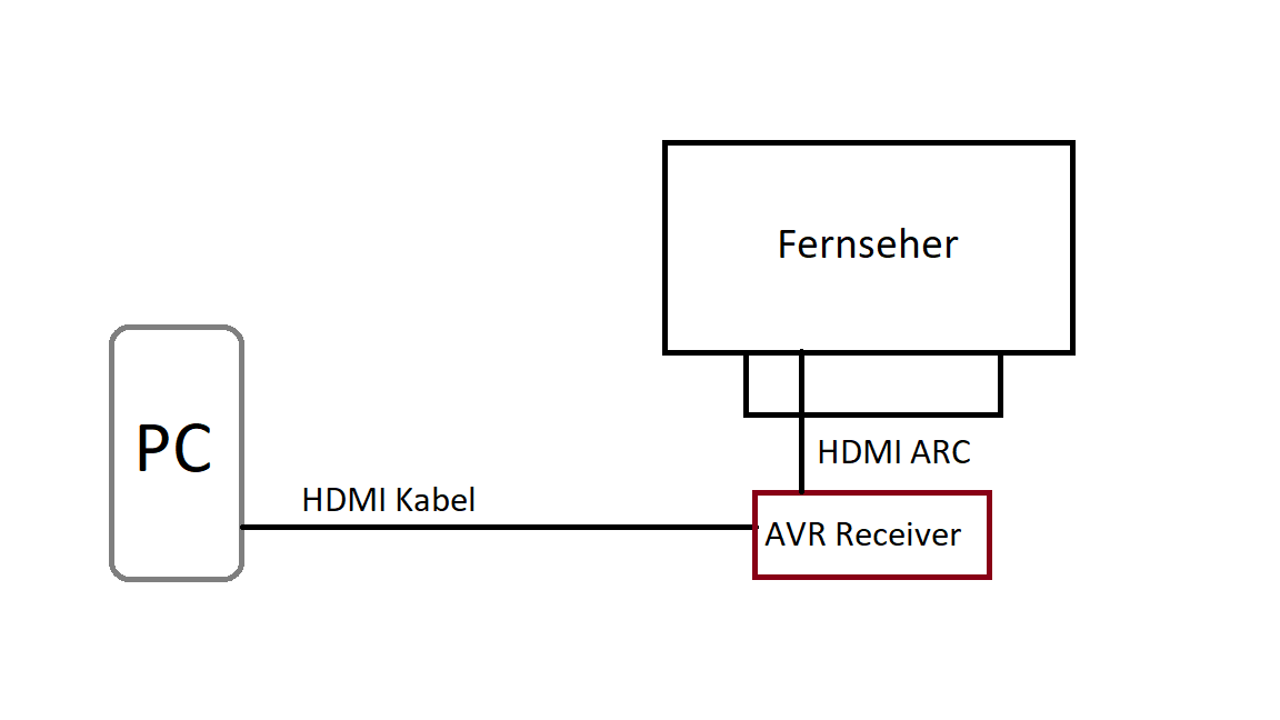 Ich habe, wie in der Zeichnung zu erkennen, meinen PC an meien AVR Receiver angeschlossen. Dieser ist wiederum über HDMI ARC mit meinem Fernseher verbunden. Bis dahin ist alles ok. Ich kann die Filme/Videos/etc. von meinem PC am Fernseher sehen und hören.