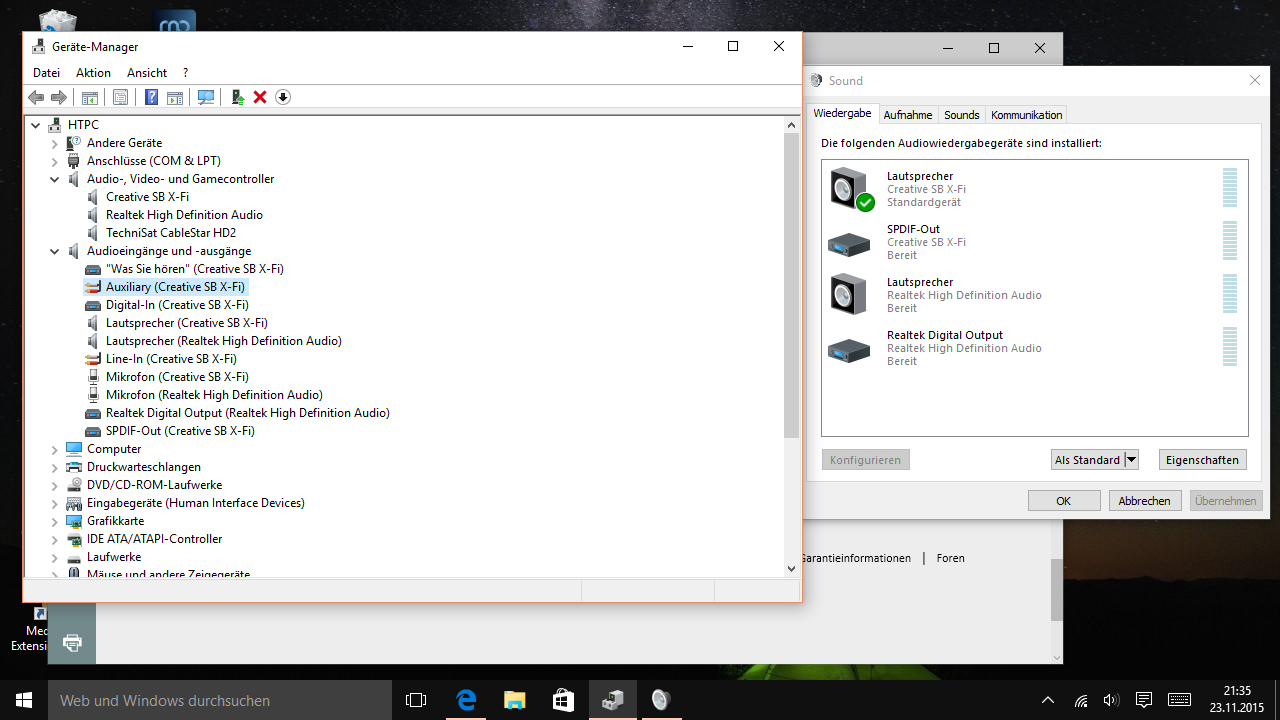 ich habe ein bisschen Stress mit meinem HTPC. Verbaut habe ich eine AMD A6-6400 APU auf einem ASRock FM2A88X Mainboard sowie eine Creative Soundblaster X-Fi. Bisher hatte es funktioniert, wenn ich das Videosignal per HDMI und das Audiosignal vom Soundblaster über ein Klinke-Cinch-Kabel zum TV übertrage. Seit dem Upgrade auf Win 10 kommt aber kein Ton mehr am Fernseher an. Die Kabel habe ich alle überprüft. Wenn ich meinen Laptop (auch Win 10) genauso anschließe, funktioniert es. Außerdem funktioniert der Ton, wenn ich externe Boxen/Kopfhörer etc. am Soundblaster anschließe. Nur lässt eben nicht am Fernseher.