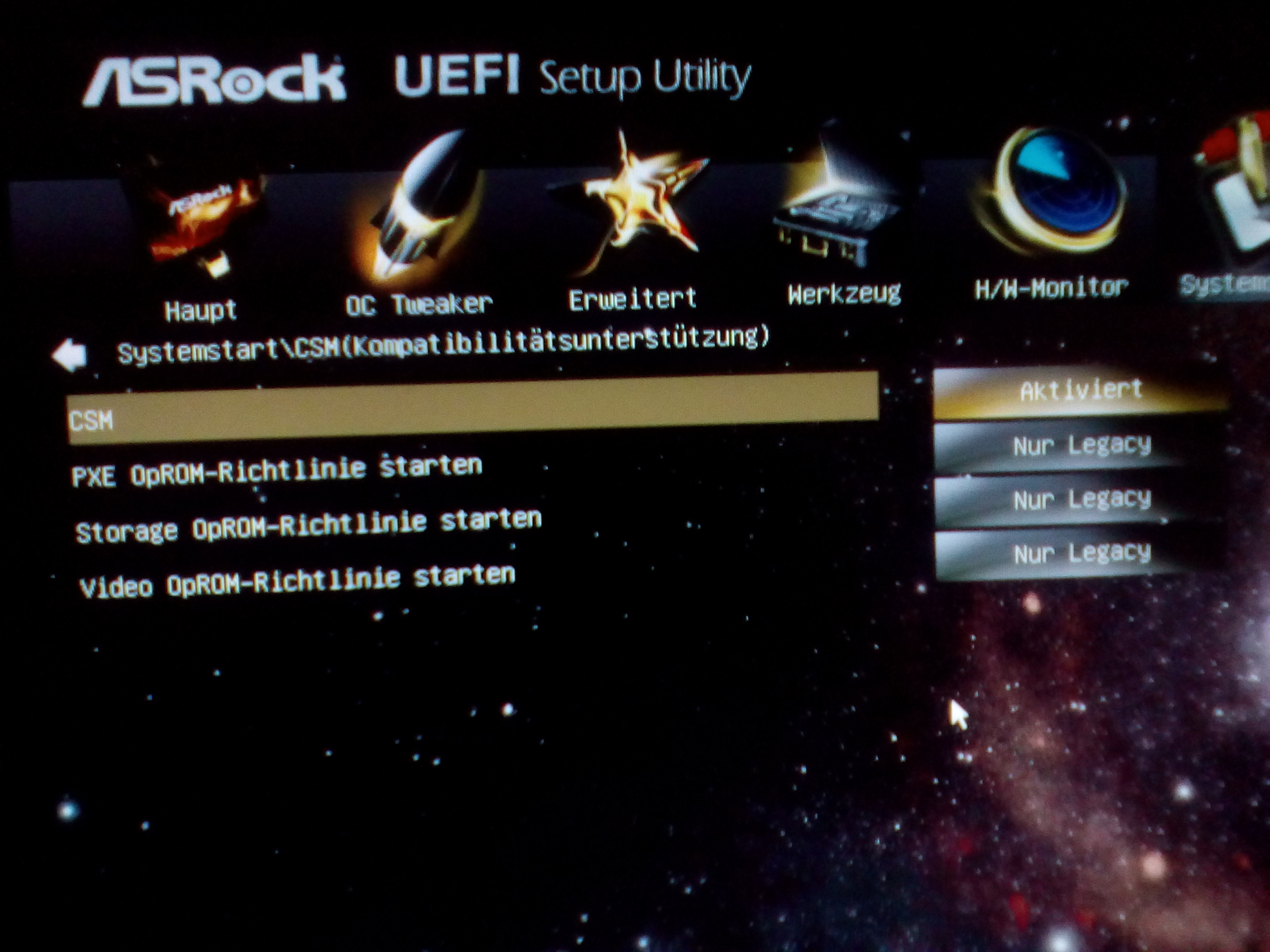 Was mir aufgefallen ist ist im meinem BIOS bzw. eigentlich UEFI Setup hab ich den CSM Kompatiblitätsunterstützer drin. Wenn ich den aktivere und alles dort drin auf nur UEFI stelle wird mir die HDD nicht mehr angezeigt, sondern nur noch der UEFI USB Stick und da wenn da steht das Windows gestartet wird, dann hängt es sich komplett auf. Wenn ich da jetzt alles auf nur Legacy stelle funktioniert alles und HDD und USB Stick wird angezeigt, nur keine Laufwerke, bzw. Treiber fehlt halt. Alles ganz komisch. Ich hab noch paar Bilder eingeblendet, vielleicht bringen die noch was.