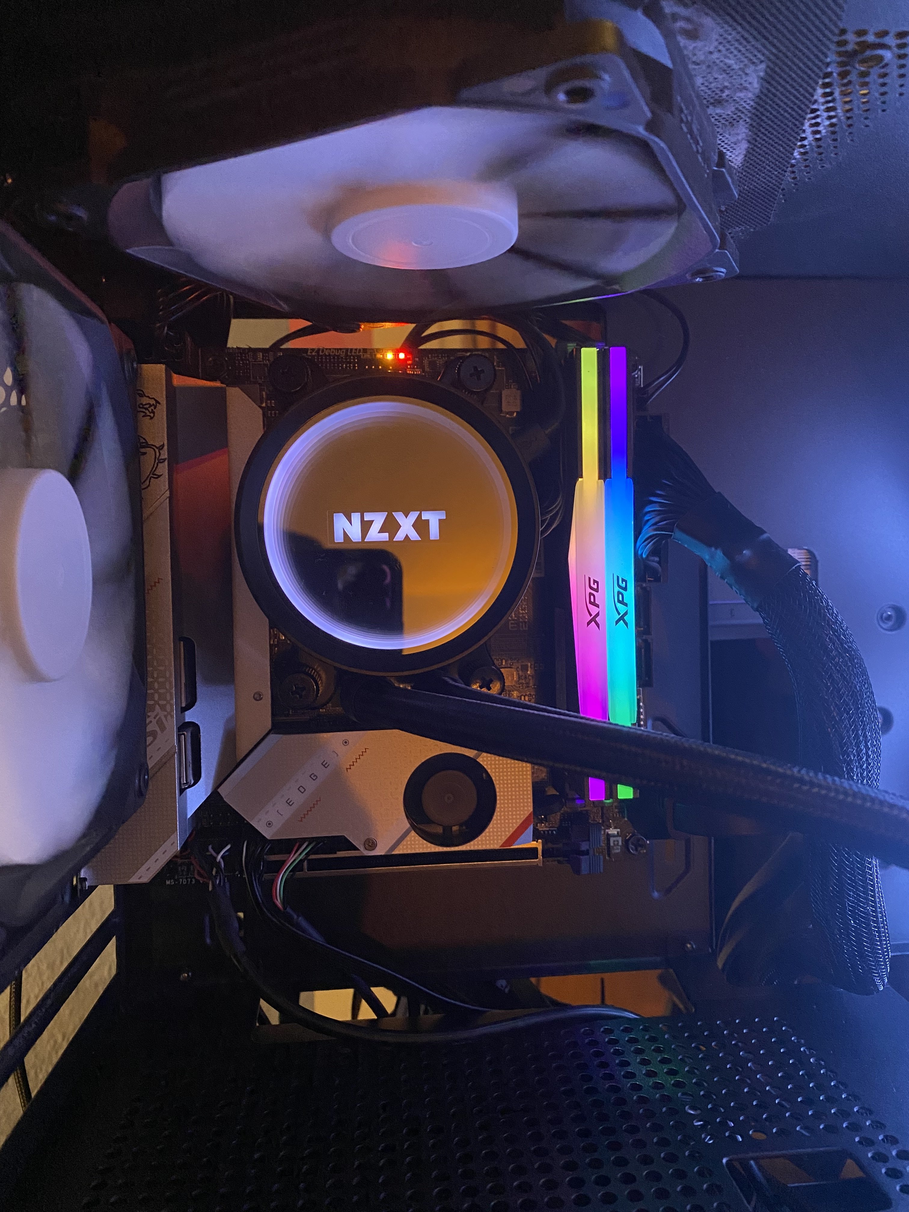 Im Anhang noch ein Bild des Mainboards im eingeschalteten Zustand, falls das irgendwie weiterhilft (Ja der obere Gehäuselüfter ist gerade noch lose, weil ich so einfacher die RAM-Riegel lösen kann 🫣😅)
