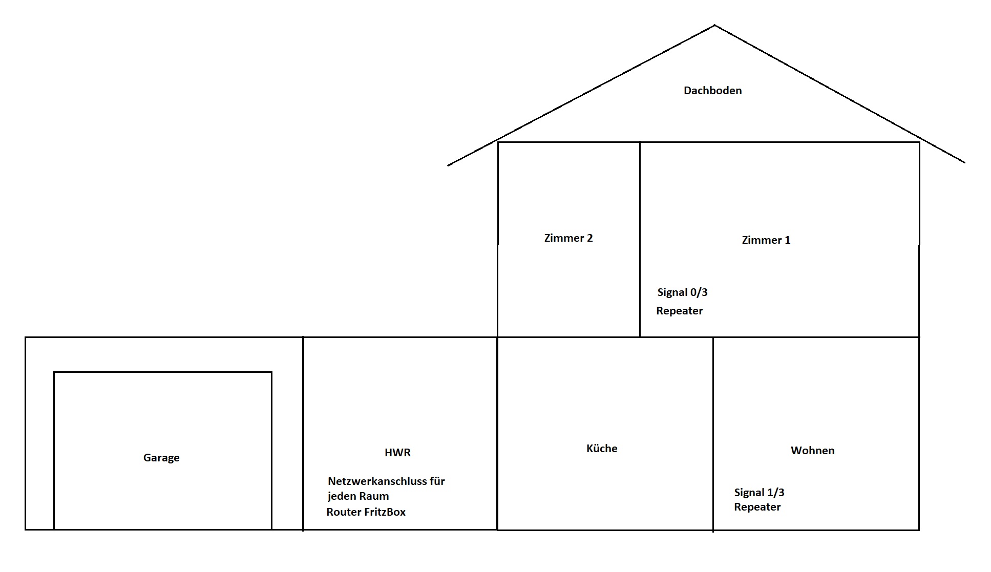 Ich habe das ganze mal mit Paint skizziert. Da jeder Raum über einen Netzwerkanschluss verfügt, kam mir folgende Idee: Gibt es evtl. einen Repeater den man nicht über WLAN mit der Fritzbox verbindet, sondern den man direkt mit einem LAN Kabel verbinden kann und dann dadurch eine gute WLAN Versorgung im OG erreichen kann? Wie muss ich da vorgehen um das fachgerecht zu machen und was gibt es da für mögliche Geräte?