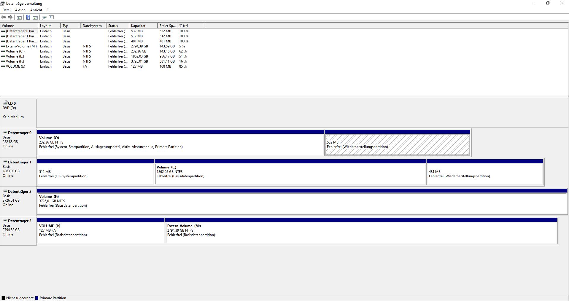 Das Laufwerk wird in der Datenträgerverwaltung erkannt auch mit Crystal Disk Info wird es erkannt. Das Laufwerk hat 2 Patitionen eine mit J und die andere mit M benannt. Zugriff auf J ist möglich.